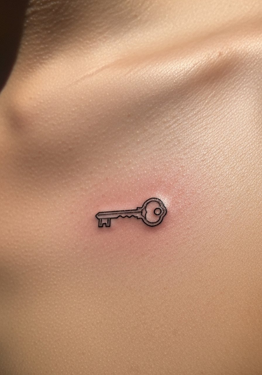 When someone wants a symbolic first chest tattoo, a small key is discreet and adaptable. Pain is moderate near the sternum. During the consult ask the artist to thicken the shaft slightly compared with ultra-micro keys so the silhouette remains clear. A usual mistake is over-ornamenting such a small motif. Extra filigree gets lost and creates fuzz. On inner chest the skin moves and stretches differently than on the clavicle, so expect subtle softening. A targeted touch-up after healing is common for tiny motif edges.