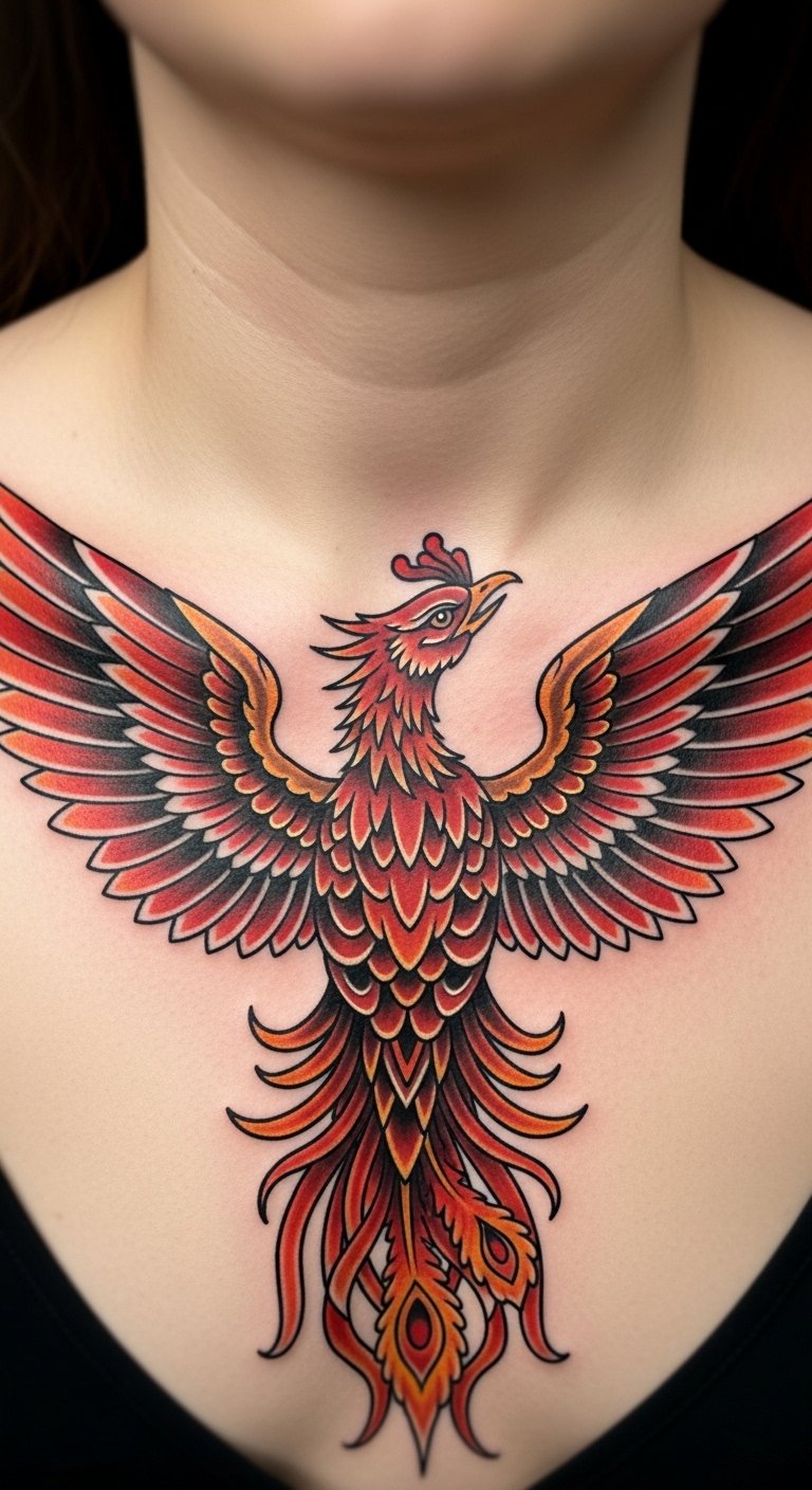 Neo-Traditional Phoenix Across Clavicles