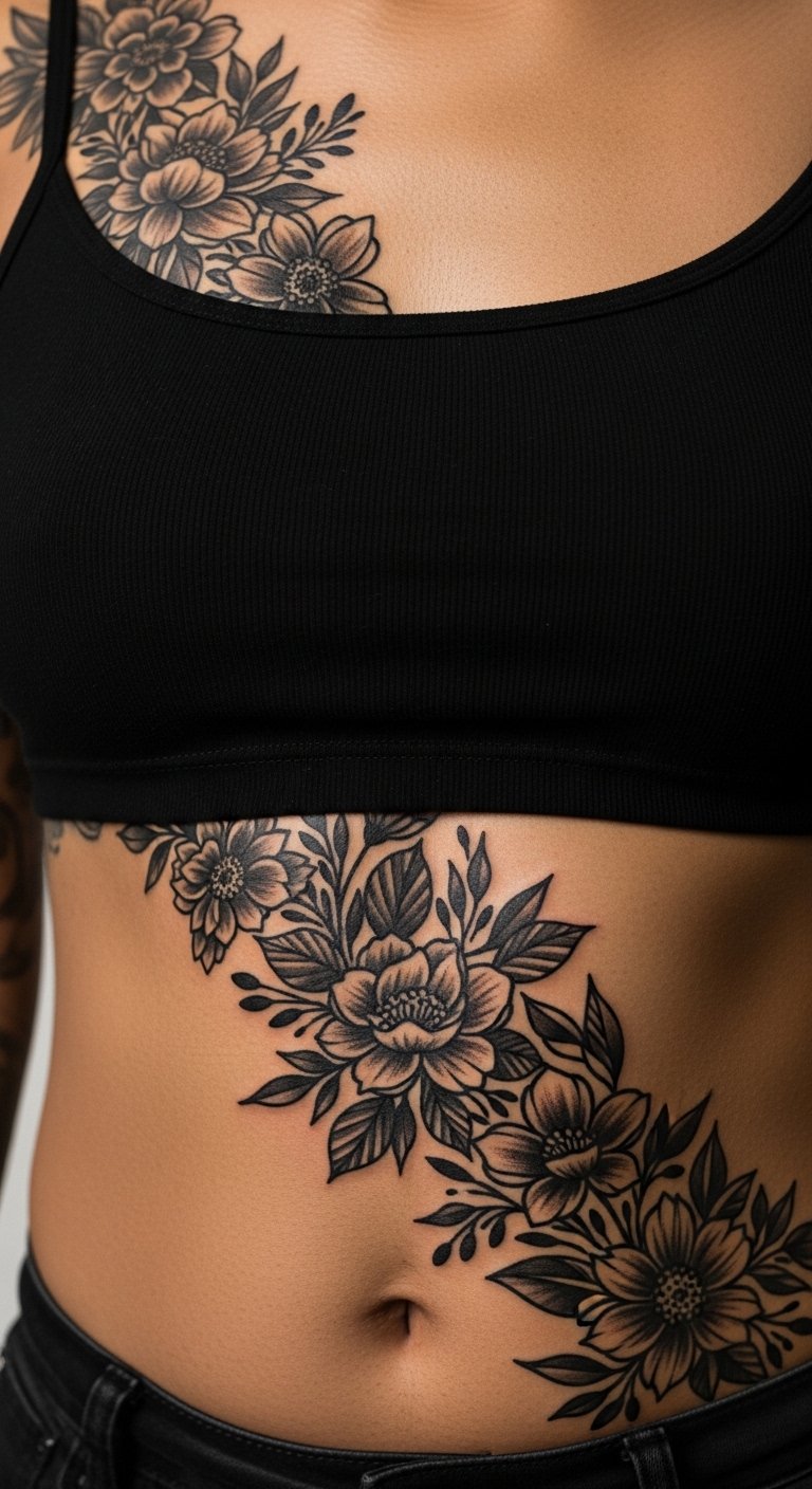 Blackwork Floral Rib-to-Chest Wrap