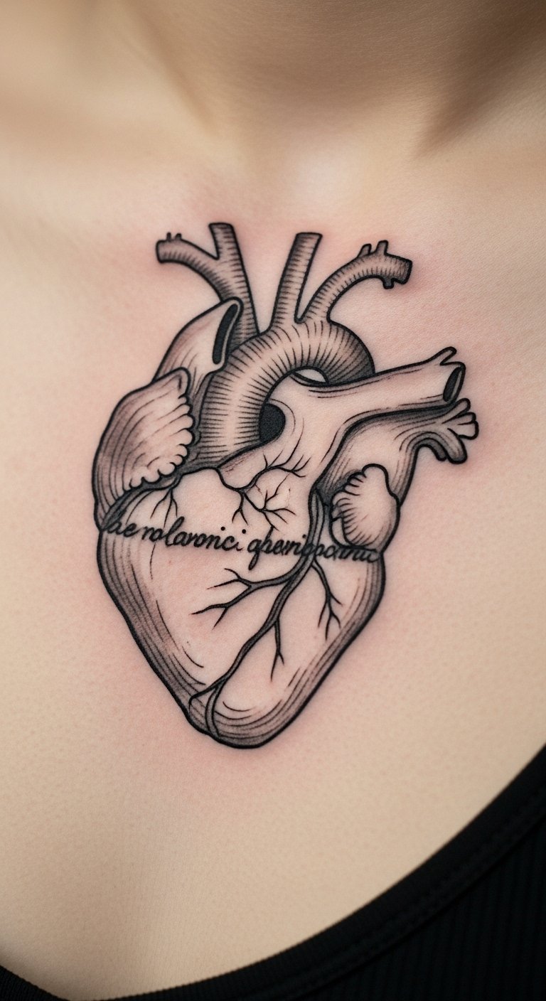 An anatomical heart centered low on the chest reads intimate and literal. Script below needs to be large enough to stay legible as the skin moves. Healing takes several weeks; keep moisturized. Avoid overly ornate script styles that lose clarity once healed.