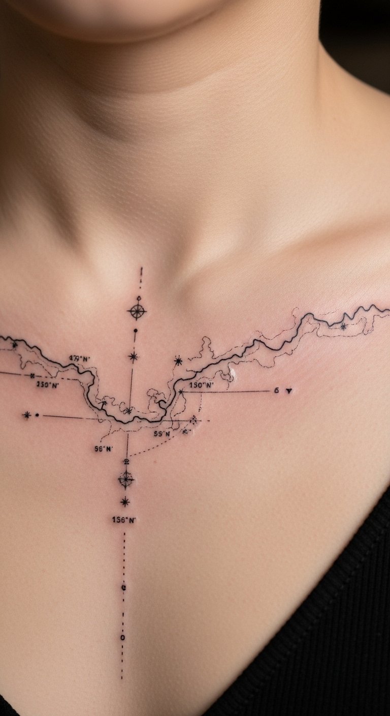 Map or coordinates are understated and personal. Keep lines bold enough to remain legible. Heals quickly but may need touch-ups for crispness over years.