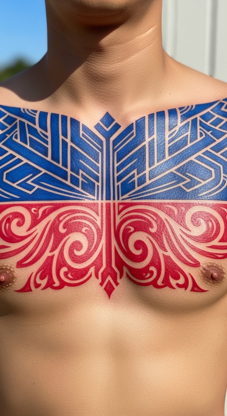 Split-color chest tattoos are graphic and modern. Clean edges are essential. Colors will shift slightly as they heal; plan saturation with your artist.