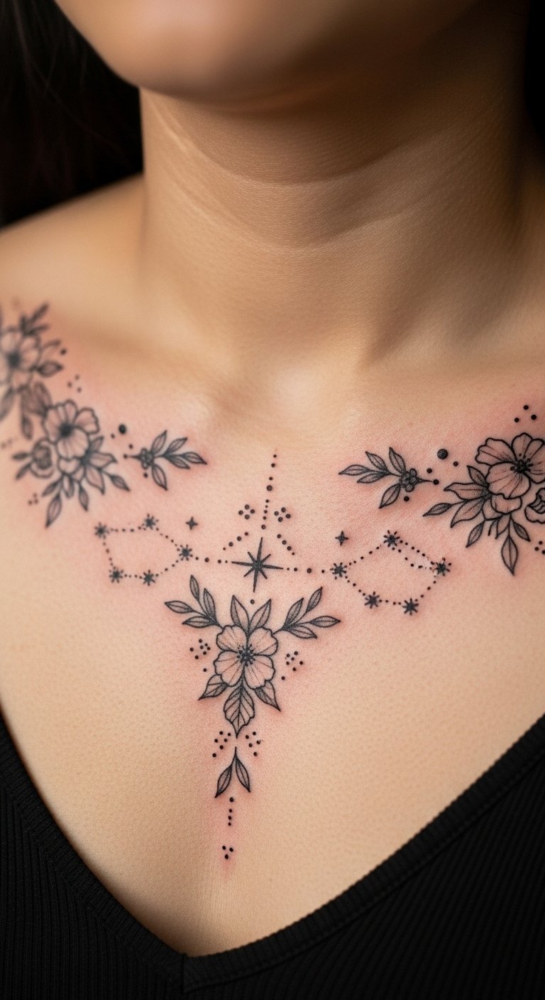 Combining constellations with florals creates a personal narrative. Keep dots spaced; florals provide visual anchors. Heals into a soft, cohesive vignette when planned well.