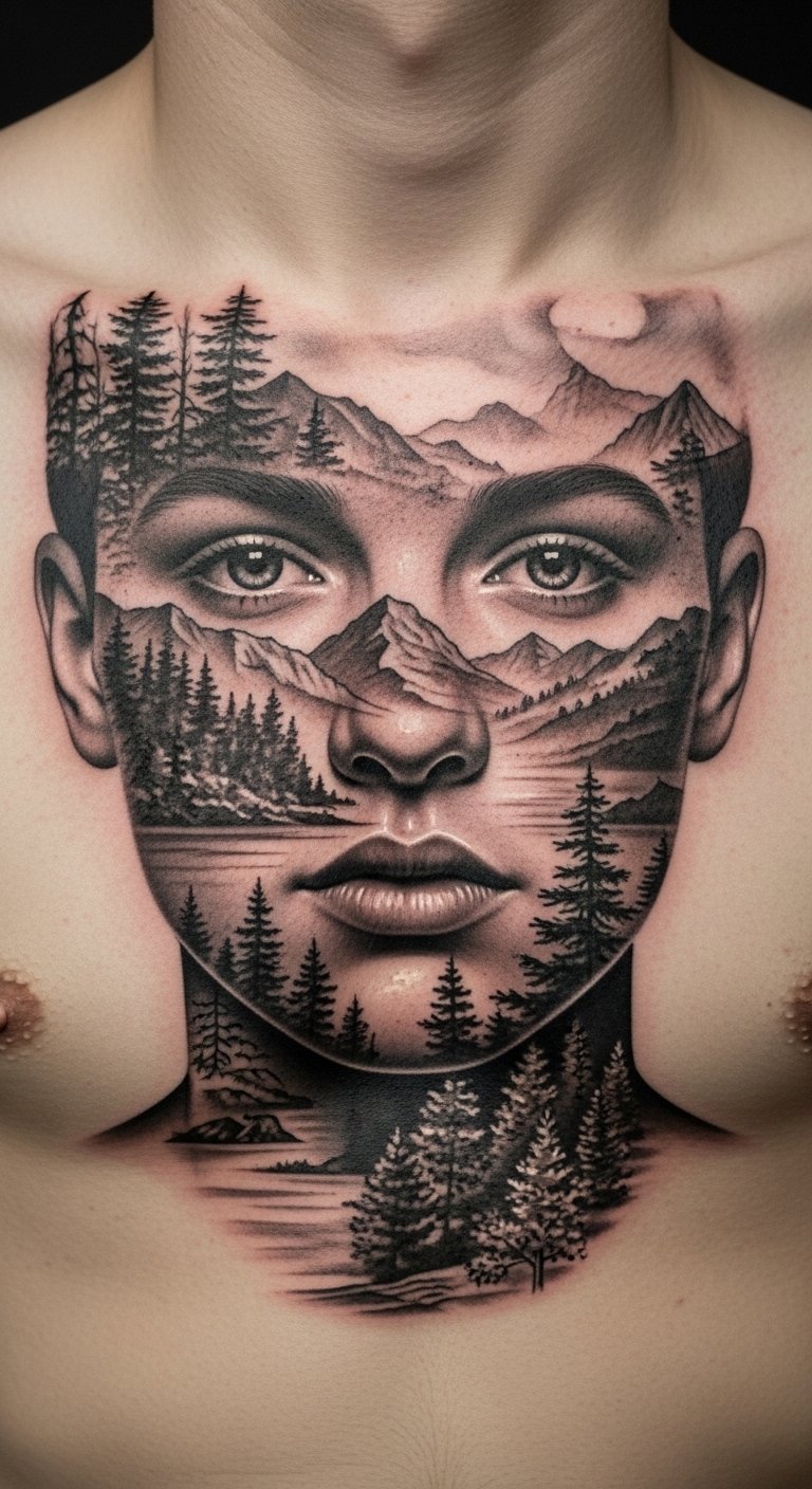 Double-exposure chest tattoos are artful. They require scale and contrast to read after healing. Artists need experience blending realism and abstract elements. Avoid tiny overlaps that become indistinct.