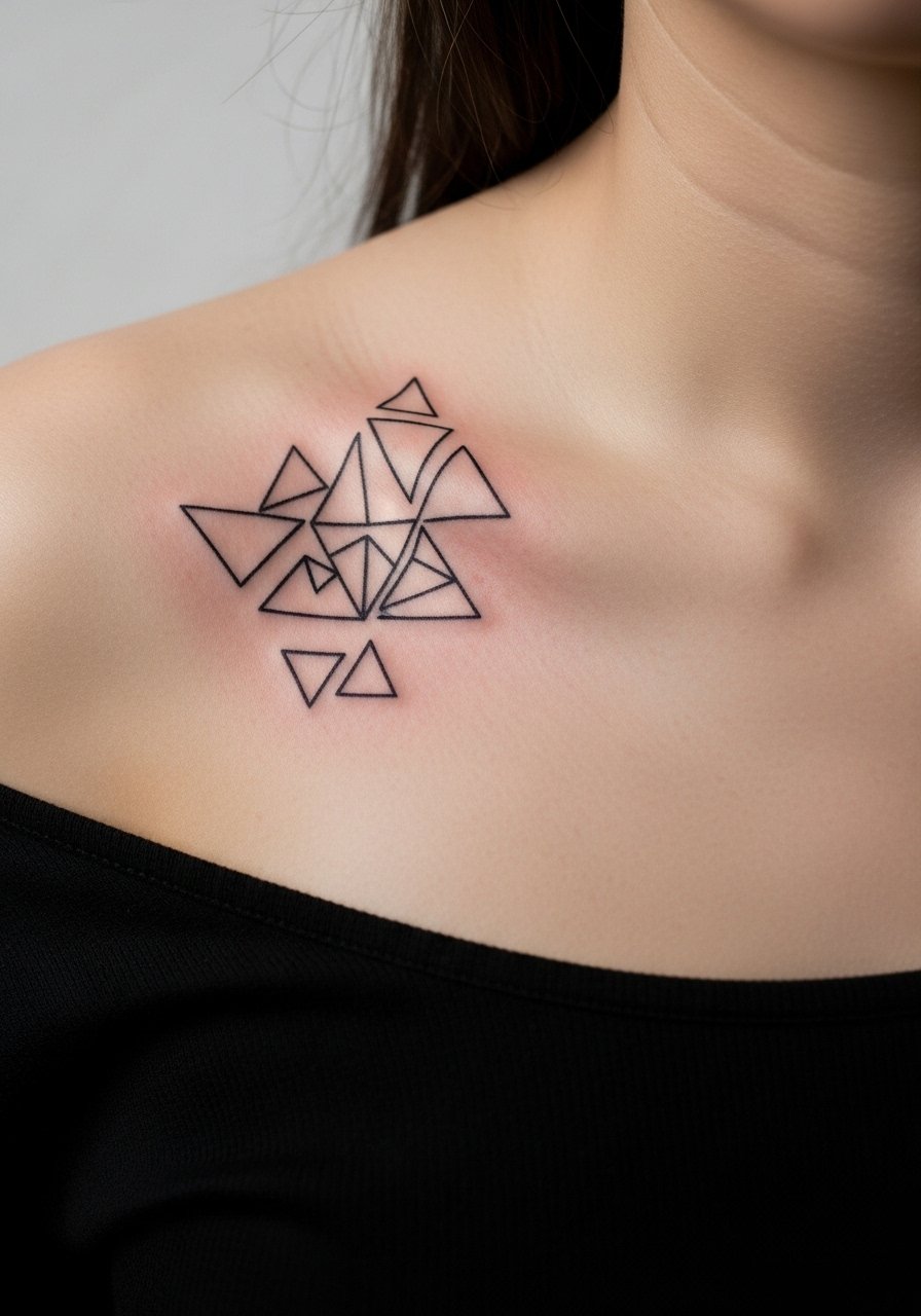 The biggest mistake with geometric clusters is scaling them down until the lines merge after a year. Pick a size that gives each triangle breathing room and insist on slightly heavier linework than a typical eyebrow-thin line. For placement, the shoulder dip reads differently when viewed head-on versus from the side, so test mockups with fitted tops. Pain is lower here than over the peak of the bone, and a single short session usually does it. If you want balance symbolism, ask for a small alignment mark so the cluster arcs with your clavicle rather than sitting flat on the skin.