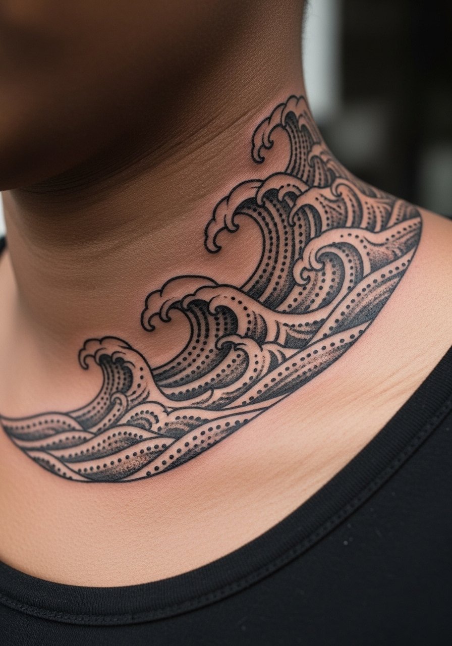 Bold blackwork gives a lot of visual contrast, and that contrast shows well on darker skin tones. Expect longer sessions and a firmer pain level because larger areas need more passes for saturation. A common error is going too dark in one sitting which increases scabbing risk; ask the artist about staged sessions. At six months the saturation will even out, and at two years it should remain strong if UV exposure is limited. If you want an ocean reference without heavy black, discuss dot work spacing to mimic waves with less saturation and lower blowout risk.