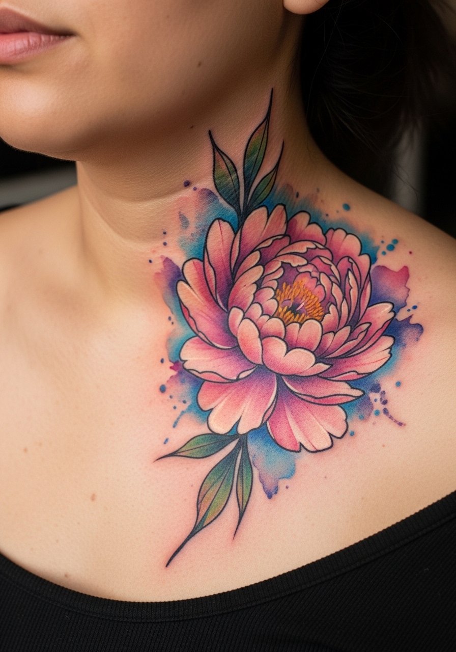 Watercolor brings painterly color but it ages differently on the collarbone. Colors near the ridge and on tanned skin often fade faster than black outlines, so ask for black anchors behind key petals to maintain shape as the color softens. Expect a longer appointment because color layering needs time to settle and heal. At six months colors will bloom and soften, and by year two some hues may wash toward pastel. Many clients schedule a color boost at year three. If you prefer longevity over vibrancy, request a black-and-gray version with strategic color highlights instead.