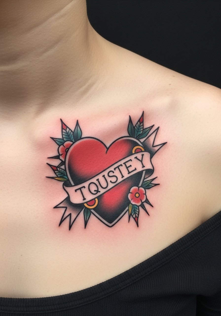 8. Neo-traditional heart with banner on the clavicle peak