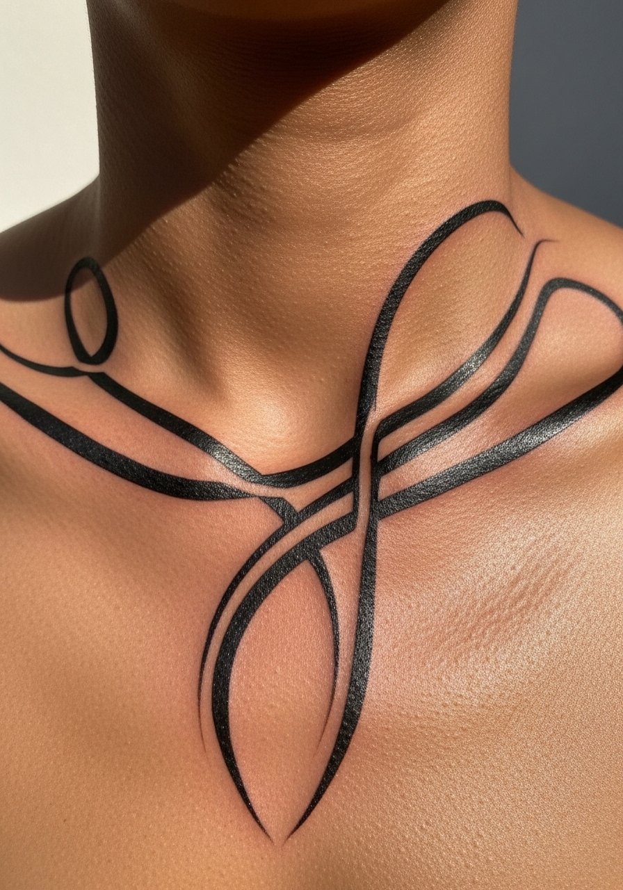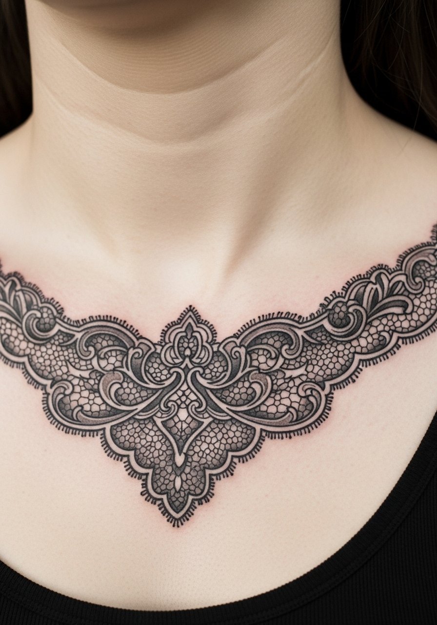 This design mimics a necklace and photographs well at formal events. When briefing your artist, show how you want negative space to act as chain links so the pattern does not feel crowded. Expect moderate pain in the hollow and a short session for a small piece. Many people forget to test concealability with actual necklines which leads to regret at work. This motif borrows ornamental forms from various traditions, so consider a small personal detail that signals respect rather than a straight cultural copy.
