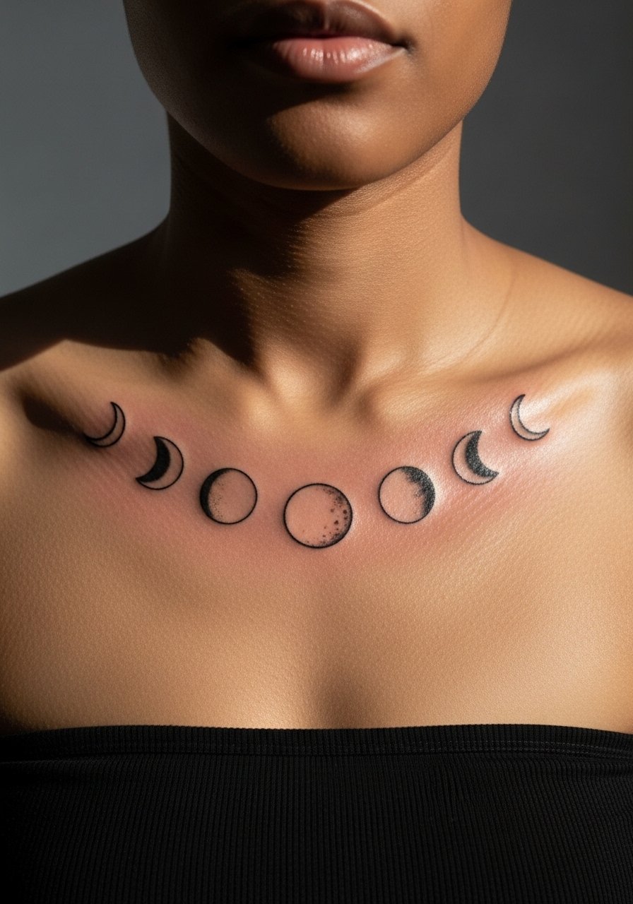 12. Minimalist moon phases arching across both collarbones