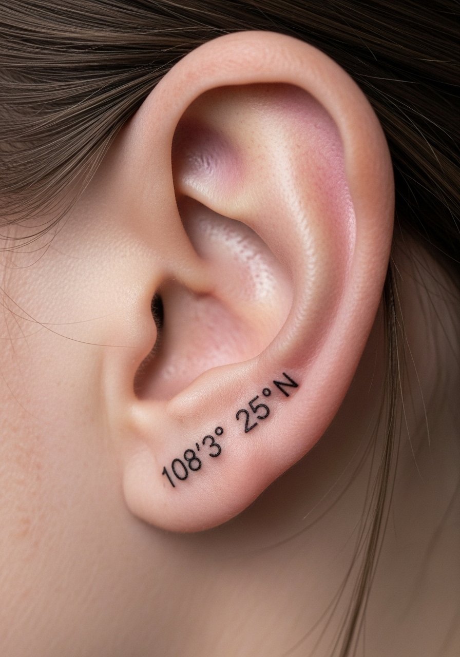 Behind-the-ear coordinates are discreet and personal. The area is bony-ish so pain is brief but sharp. Keep the design tiny—fine line numerals near hairline look clean but risk blurring if too thin. Healing is quick but watch hair oils and shampoo. This placement is great if you want a private memory that only shows in certain hairstyles. Ask your artist for healed examples in similar placement.