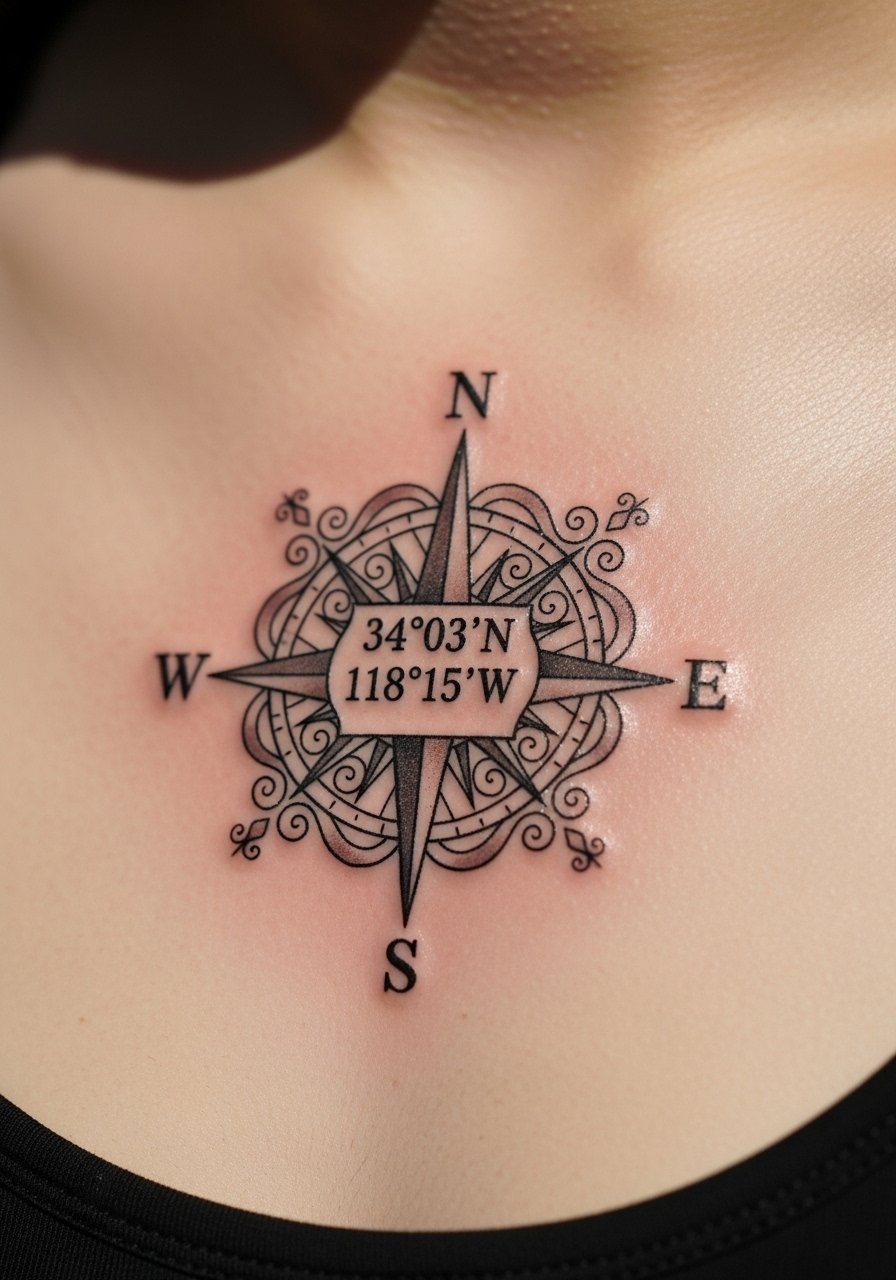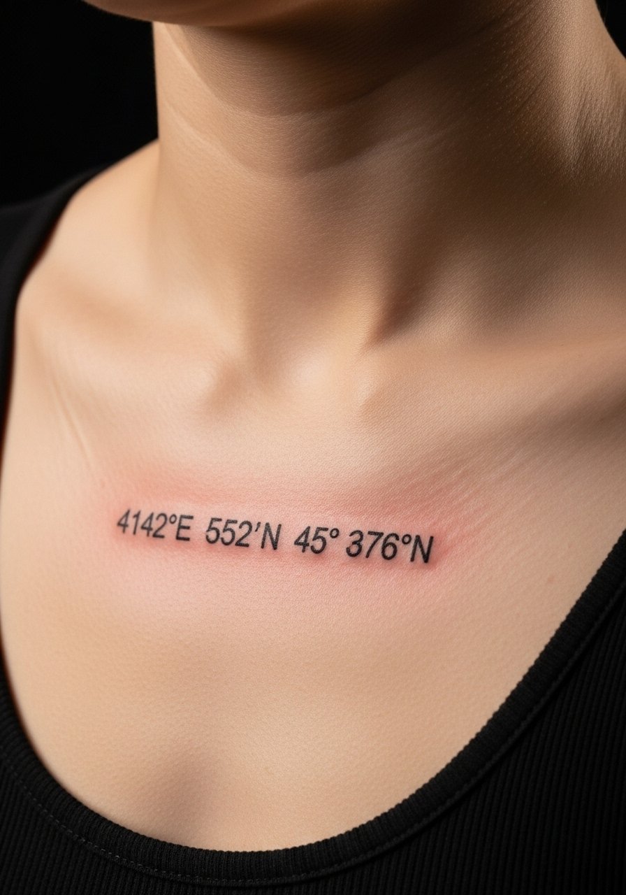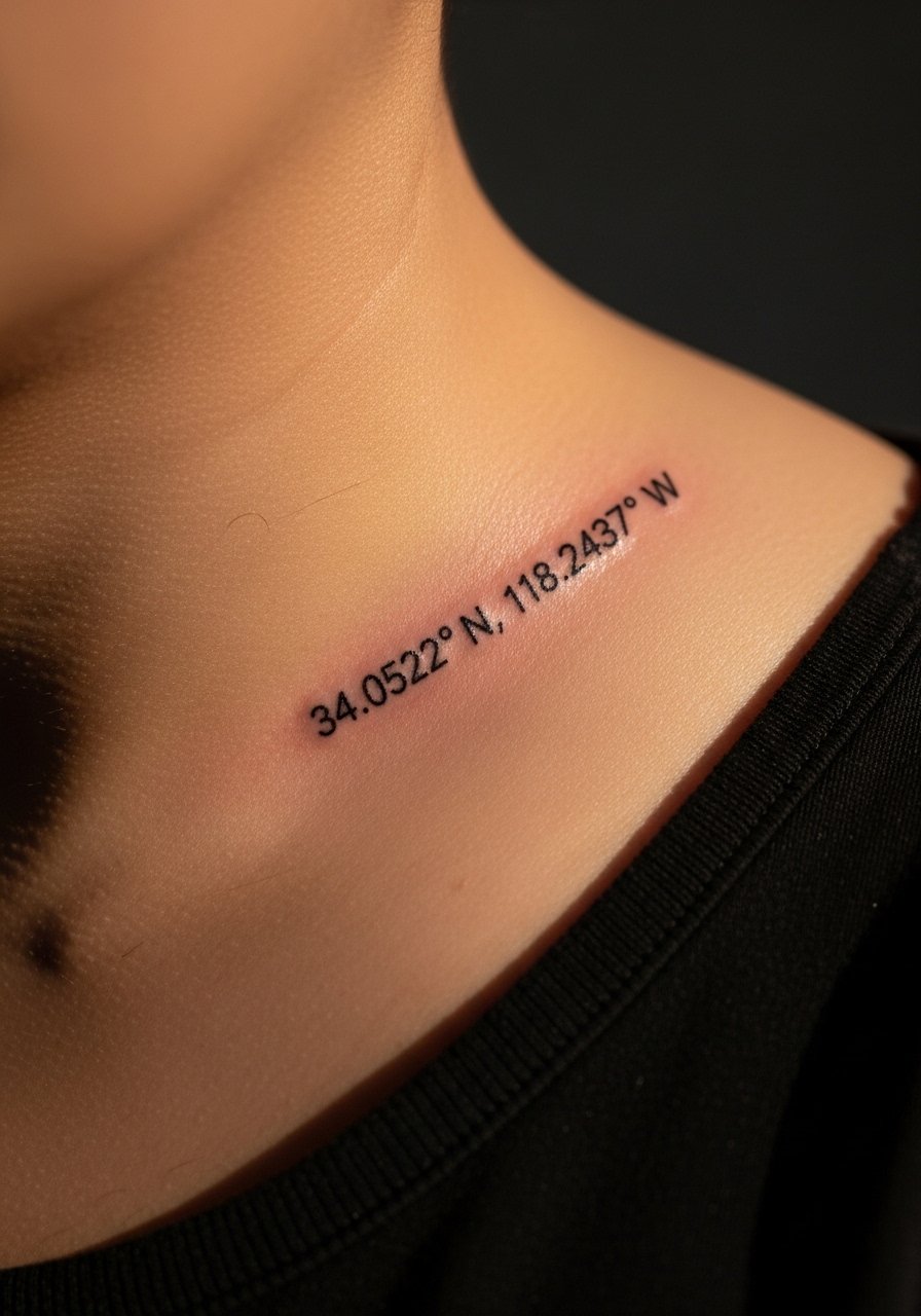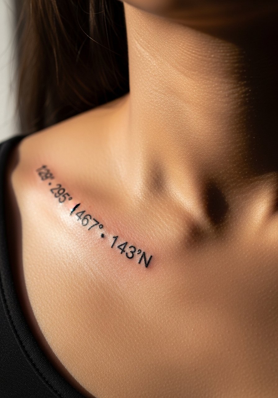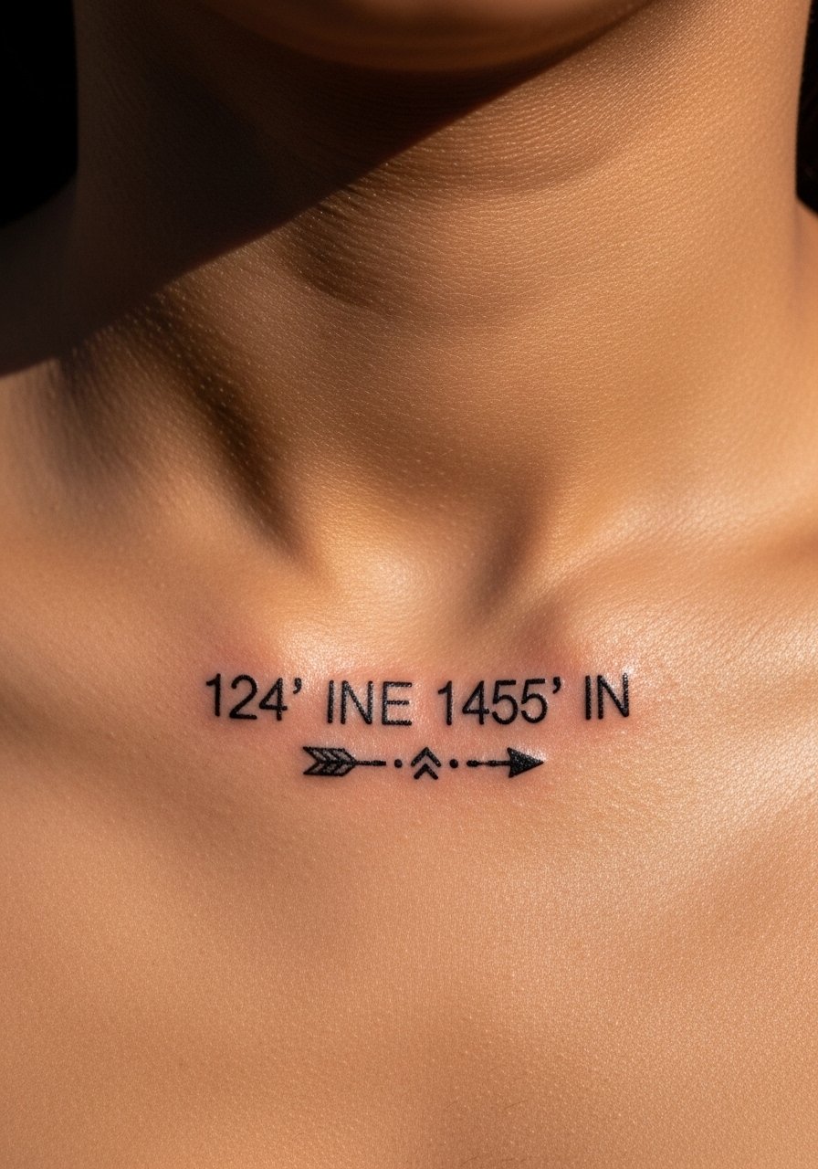 A tiny arrow gives motion to coordinates—great if the place changed your direction in life. Clavicle hurts a bit due to bone proximity but sessions are quick. Keep numerals medium-weight to survive natural skin movement and clothing friction.