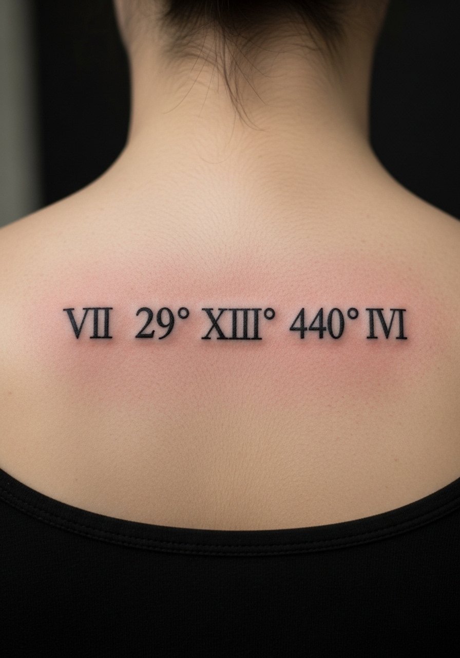 Translating coordinates into Roman numerals adds a timeless feel and hides the literal numbers for privacy. Upper back is low pain with roomy canvas, so spacing is easy. This style ages well as bold numerals hold. If you want a subtle reveal, place beneath hairline or between shoulder blades. Check stencil spacing carefully—Roman numerals need consistent weight.