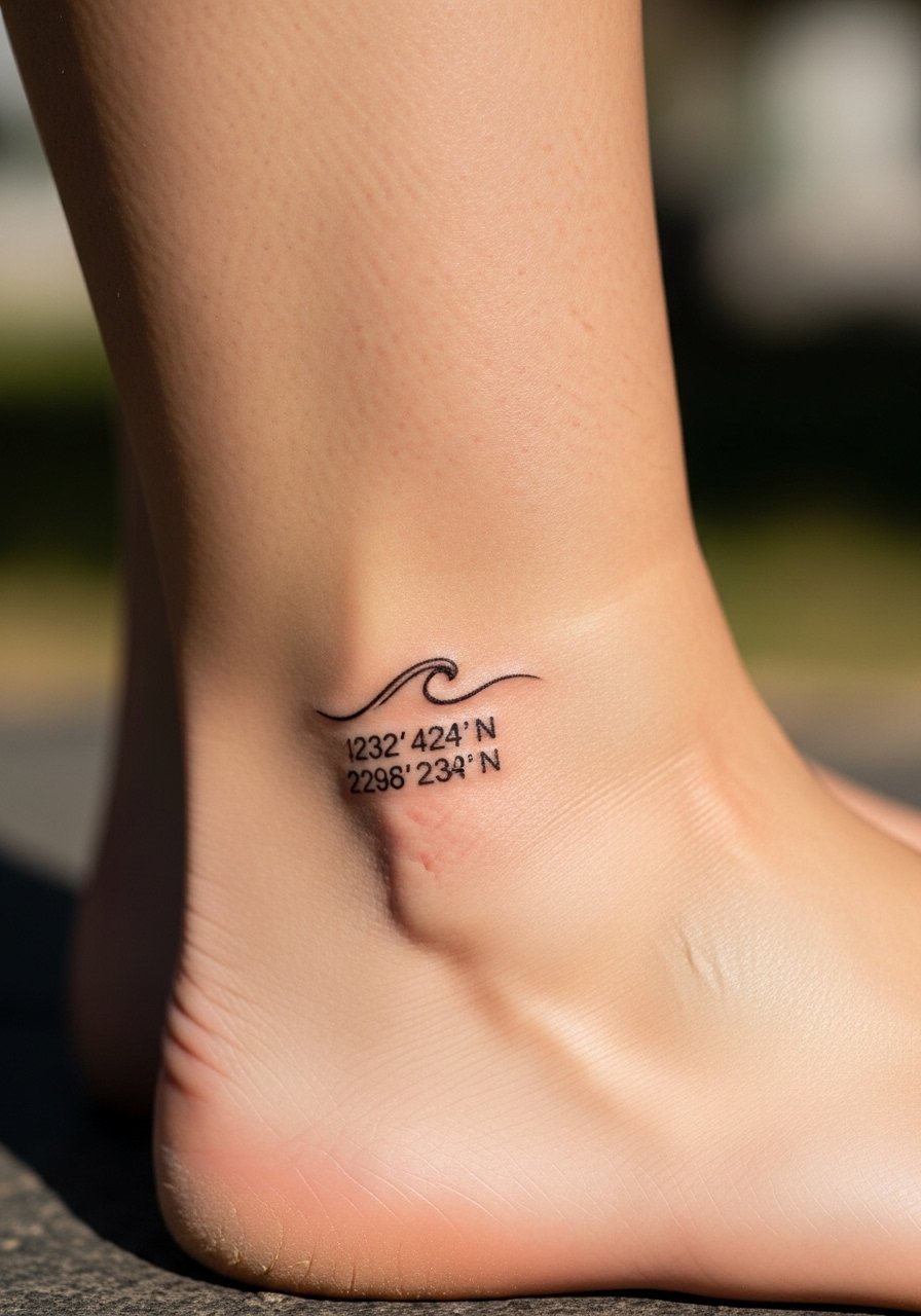 I love seeing coordinates tucked into a simple wave—the icon points to a place and feeling. The ankle is visible with shoes off and looks delicate with a small illustrative flourish. Avoid over-detailing; tiny waves plus numbers can get muddy. Pain is brief but stinging on the bone. Keep footwear loose during the first week.