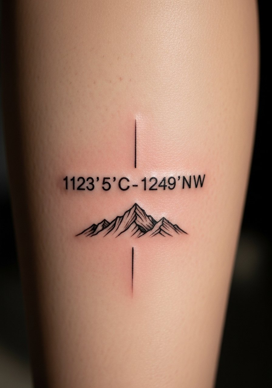 I recommend calf placements for outdoor memories—visibility is easy and pain is mild. Combining coordinates with a tiny mountain or peak graphic anchors the memory. Heals reliably if you avoid tight pants early on. Over-detailing the mountain at a very small scale is a common mistake; keep it iconic and bold.