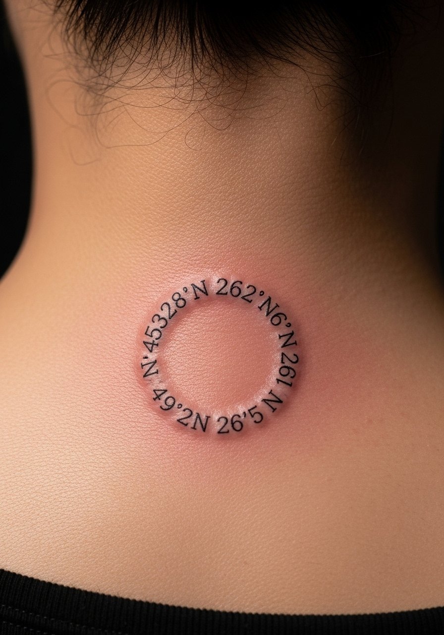 A circular layout around a dot or micro-compass looks modern and balanced. Back-of-neck tattoos are easily hidden with hair and are low maintenance. Expect skin movement and some fading over time; slightly bolder numerals resist this. Avoid too many tiny details in the circle—clarity is king.