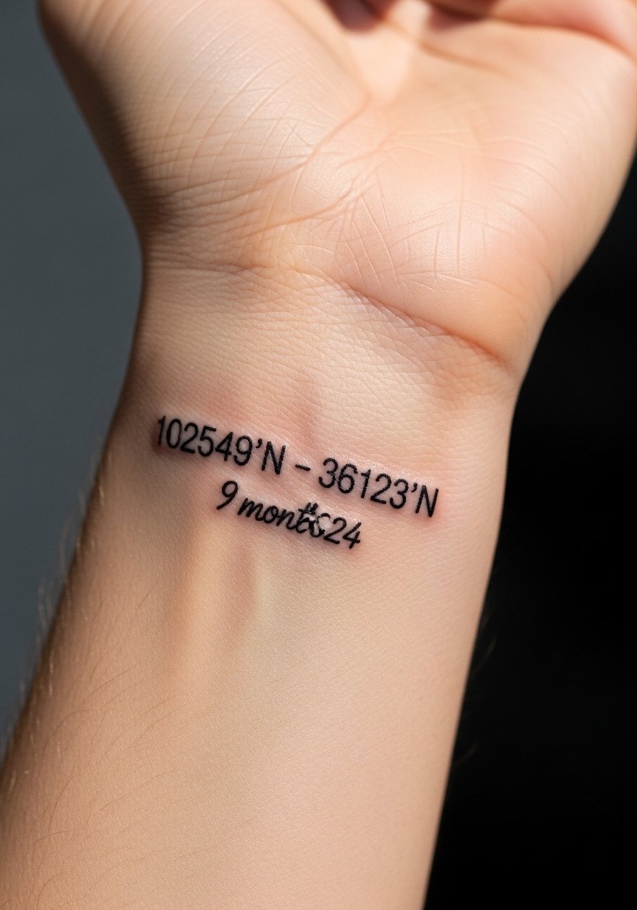 I got a small wrist coordinates piece to mark a city I lived in. Fine line keeps it subtle and intimate. The inner wrist shows the number alignment nicely but expect some early blur after a year if lines are too thin. Pain is short-lived—more annoying than intense. Healing is about 2 weeks for surface, full settling in 2–3 months. Avoid lines thinner than 0.3mm; ask for slightly bolder numbers for longevity. Saniderm or Aquaphor in the first days helps prevent scabbing and loss of crispness.