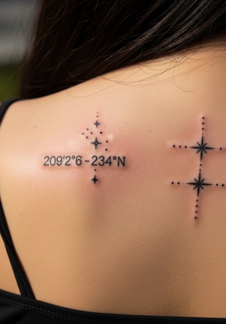 Shoulder blade coordinates are private and photograph nicely. Adding a tiny star cluster suggests a moment that felt cosmic. This area tolerates fine lines but avoid ultra-thin digits. Healing is calm—just watch straps and bras during the first week. Artists I follow say healed references for shoulder blade pieces are essential to understand how lines soften.