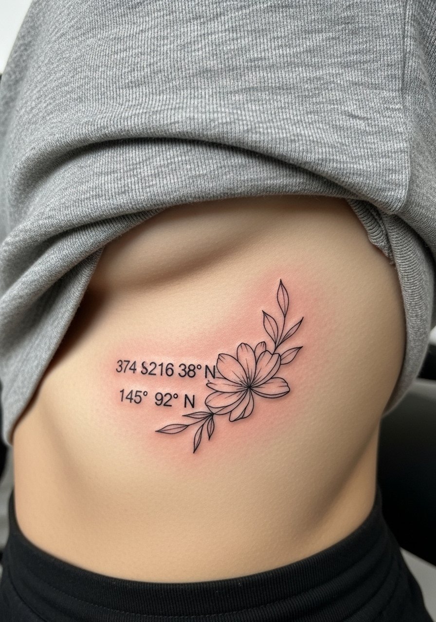 Hiding coordinates inside a floral silhouette creates a secret message within a pretty piece. Ribcage pain is intense but the result is personal. Keep the numerals slightly bolder than the floral lines to keep readability over time. Avoid overcrowding the flower—legibility is easy to lose in tiny petals.