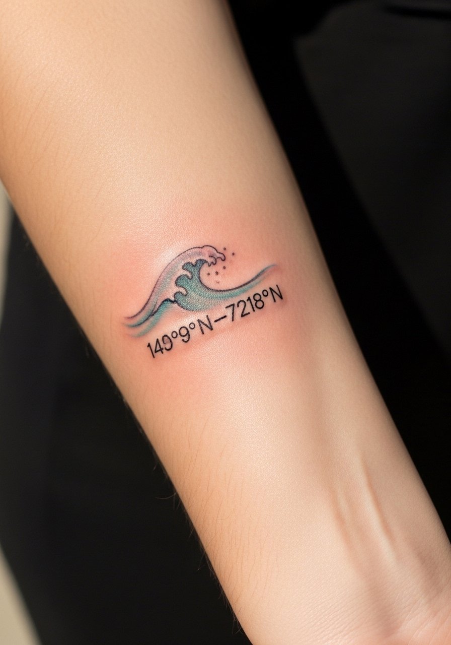 Pairing coordinates with a date script adds context to the memory—great for births or milestones. I’ve seen simple wrist pairings hold up well if the script is medium-weight. Tiny cursive can blur; prefer readable numerals and slightly bolder date letters. Healing needs sunscreen later to prevent fading.