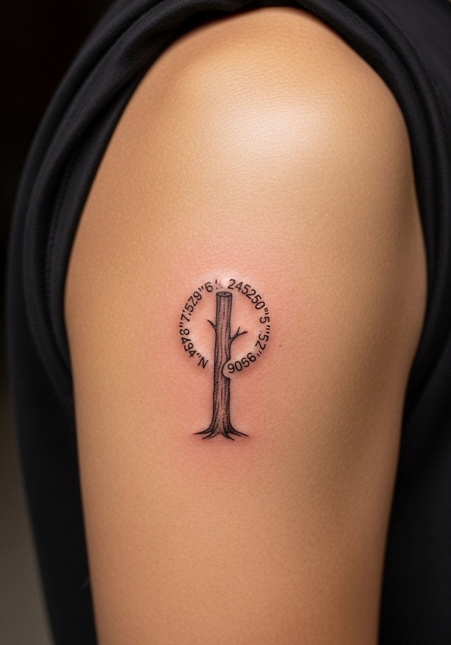 An upper-arm tree trunk with coordinates etched makes the memory feel rooted. Upper arm is forgiving: low pain and strong healing. Keep lines bold within the bark to avoid blurring. This approach reads well healed because texture hides minor softening.