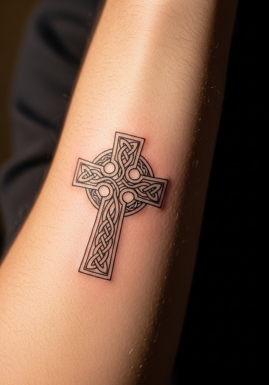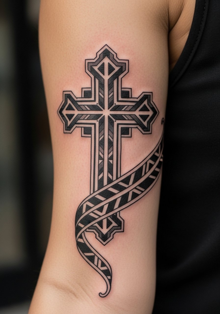 Geometric blackwork crosses marry crisp lines and heavy fills—great for people who want boldness without color. Upper arm placement is forgiving and the skin holds geometric edges well. I’ve noticed celebrities and style-forward clients favor this for a contemporary look that’s durable. Pain is moderate; heavy black fills can require longer single sittings. Avoid tiny tessellations that might blur; large, intentional geometry fares best over time.