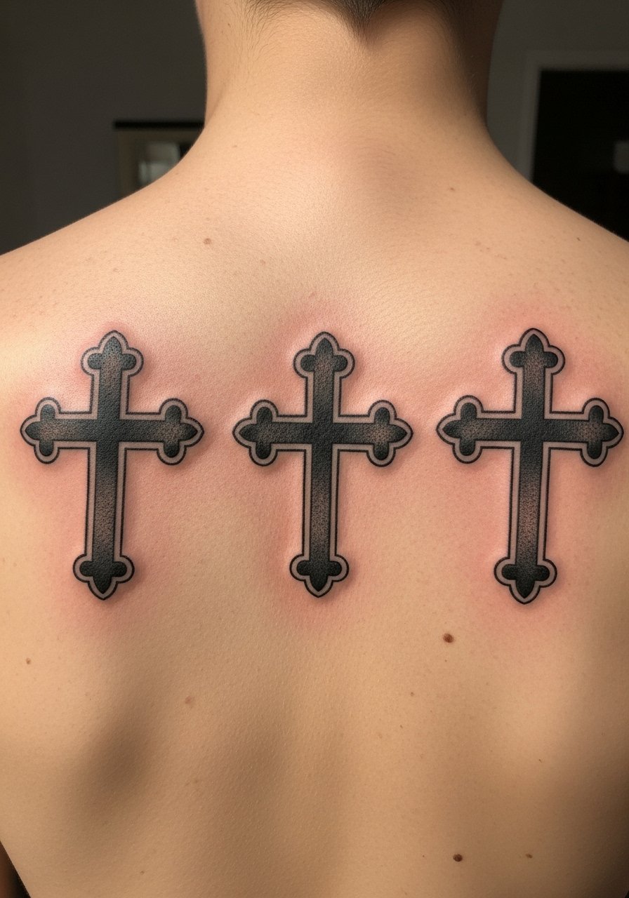 The three-cross motif instantly evokes the crucifixion scene and works beautifully across the upper back where there’s room to balance size and spacing. In my experience, blackwork shading gives gravitas and heals predictably; it’s a go-to when people want a meaningful memorial. Placement on the back keeps the piece private unless you choose to display it. Pain here is moderate—more than the forearm but less than ribs. Artists who shine in realistic blackwork (think Boris Bianchi-style) will do layered shading that reads clean healed. Avoid tiny crosses with dense shading; they tend to fill in. Ask for stencil placement checks so the spacing feels personal.