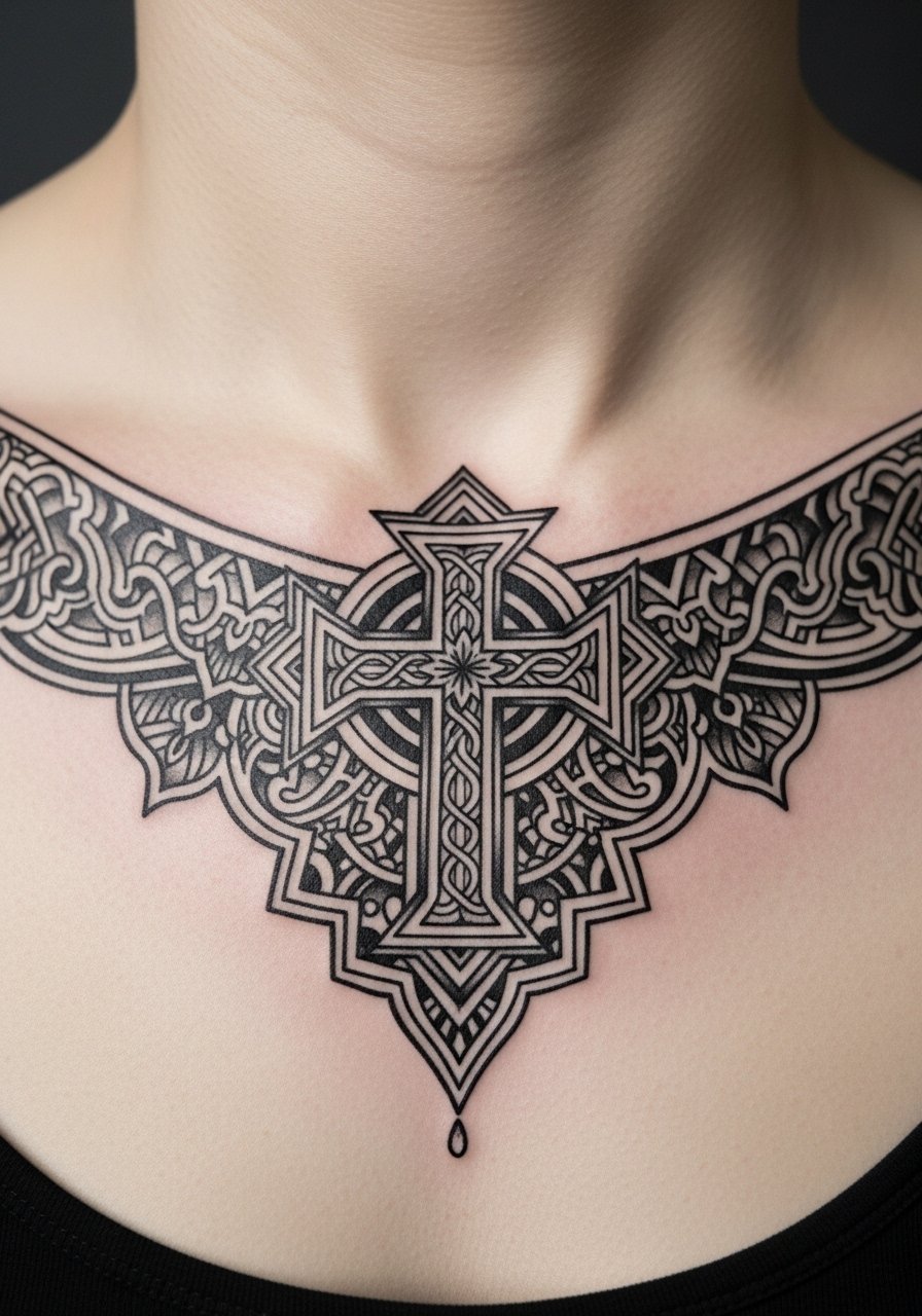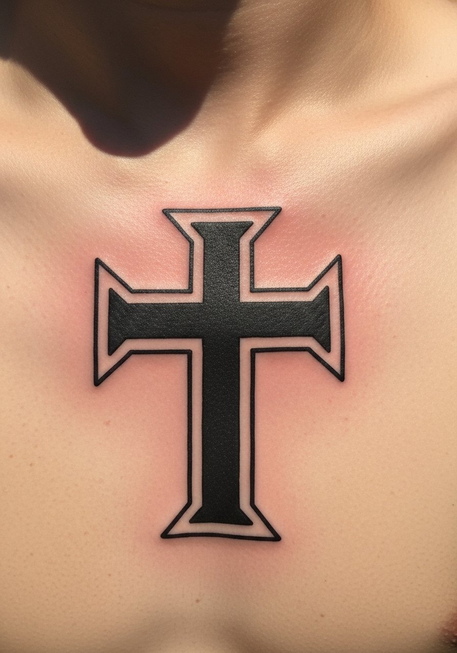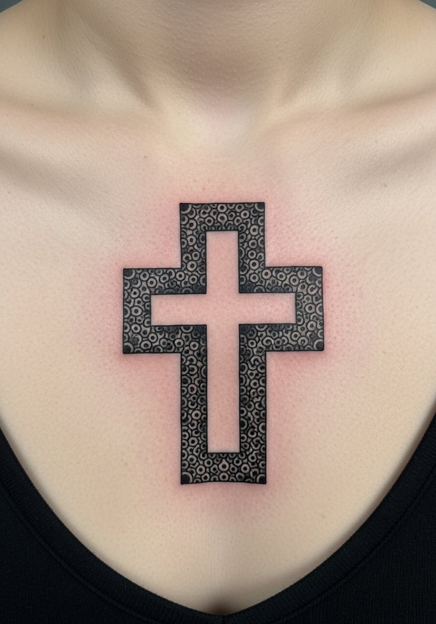 Negative-space crosses use surrounding black or pattern to reveal the symbol—striking on the sternum. Sternum work is painful but the result is sculptural and modern. I’ve noticed negative-space techniques age fairly well because the main contrast is black. The risk is bleeding into the borders if the artist isn’t precise; choose someone experienced in geometric blackwork (Boris Bianchi-style artists are good references). Expect the piece to look strong from a distance long-term.