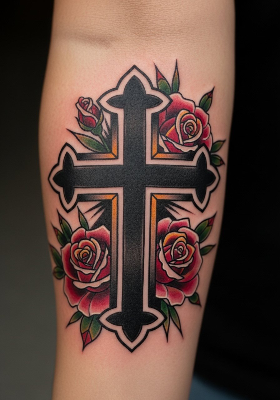 Pairing a cross with roses balances faith and love—roses soften the symbolism while keeping the cross visually central. Outer forearm placement shows the image often without being permanent face-level visible. In my experience, neo-traditional shading holds well when outlines are solid. Pain is manageable and healing predictable. Watch out for overly pale color fills; thin color spots (especially light yellows) can fade faster—ask your artist about saturation. If you’re aiming for a timeless feel, request slightly bolder outlines so the combo reads well as it ages.