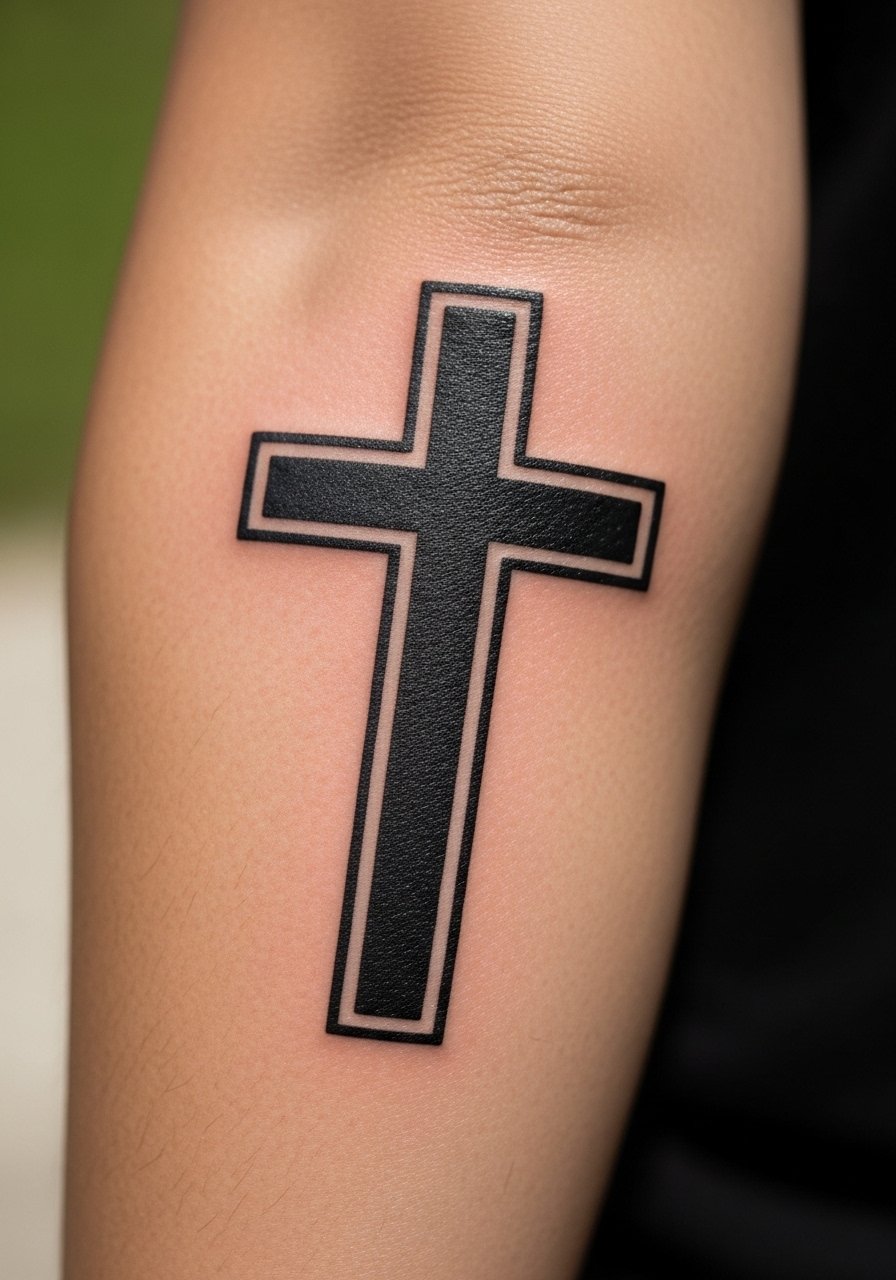 A thick-lined forearm cross reads like a quiet declaration—clean, masculine, and low-maintenance. I’ve seen these age beautifully because the heavy lines resist blowout and fading. Placement is great for visibility and for testing how a visible faith tattoo fits your daily life. Pain is lower on the outer forearm, and healing is straightforward if you avoid heavy friction. Common misstep: making the cross too narrow—wider arms benefit from proportionate scaling so it doesn’t look cramped. If you want a modern edge, ask for small geometric fills or negative-space detailing.