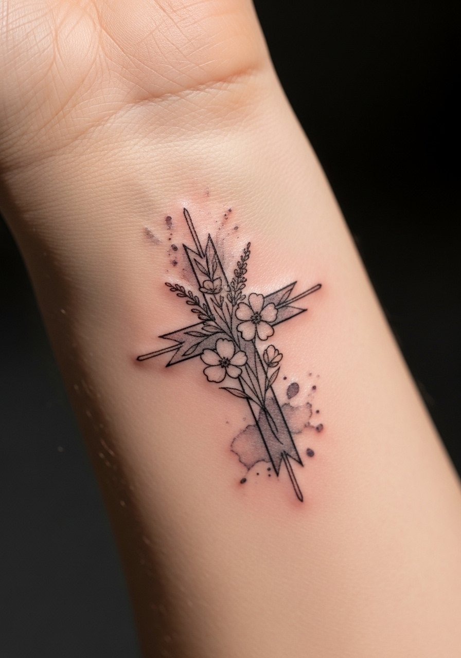 Watercolor crosses inject color and softness into a traditionally stark symbol. On the wrist or ankle, the effect is wearable and romantic, but I always warn people: watercolor fades faster in high-friction areas. From what I’ve seen, keeping a solid black outline under the color helps longevity. Wrist placement makes touch-ups more likely over the years, so go in knowing maintenance could be needed. Pain is mild, healing straightforward. Ask your artist about color saturation and how they plan for healed vibrancy; artists who do illustrative watercolor well will show you healed pieces. Avoid tiny watercolor splashes that will disappear—opt for defined color zones.