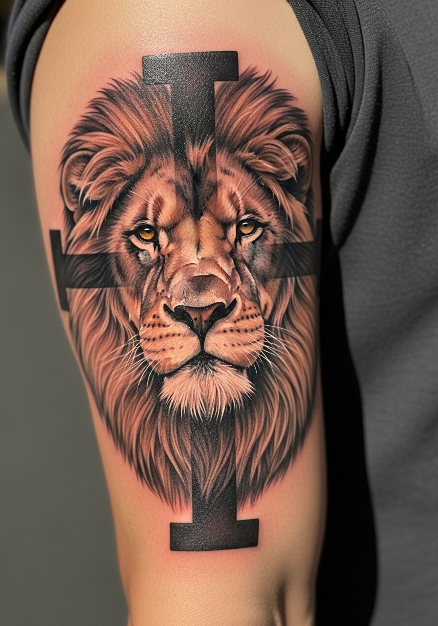 A lion-cross combo reads as courage and faith intertwined. The bicep offers a broad canvas for detailed realism blended with symbolic blackwork. From conversations with artists I follow, this fusion needs an artist who does both realistic animal work and bold graphic symbols (Roxx-style blackwork artists often pull this off). Pain on the bicep is moderate and sessions can span multiple days. Realism takes well to black and gray shading, which also ages predictably. Common mistake: cramming too many small features into the lion’s mane—keep major forms clear so the image still reads from a distance.