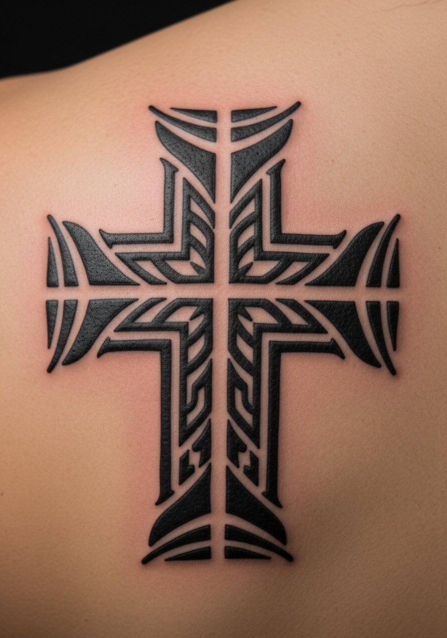 Tribal crosses borrow cultural patterns to create a powerful visual. Shoulder blade placement lets you go medium-large without being constantly visible. I’ll caution: tribal elements should be approached respectfully—bring references and be ready to discuss cultural meaning with your artist. On the shoulder blade, blackwork holds well because the skin isn’t as friction-prone. Pain is moderate but tolerable for most. To avoid regret, stay away from generic “tribal clip art” and find an artist who can adapt traditional motifs into a custom, meaningful composition.