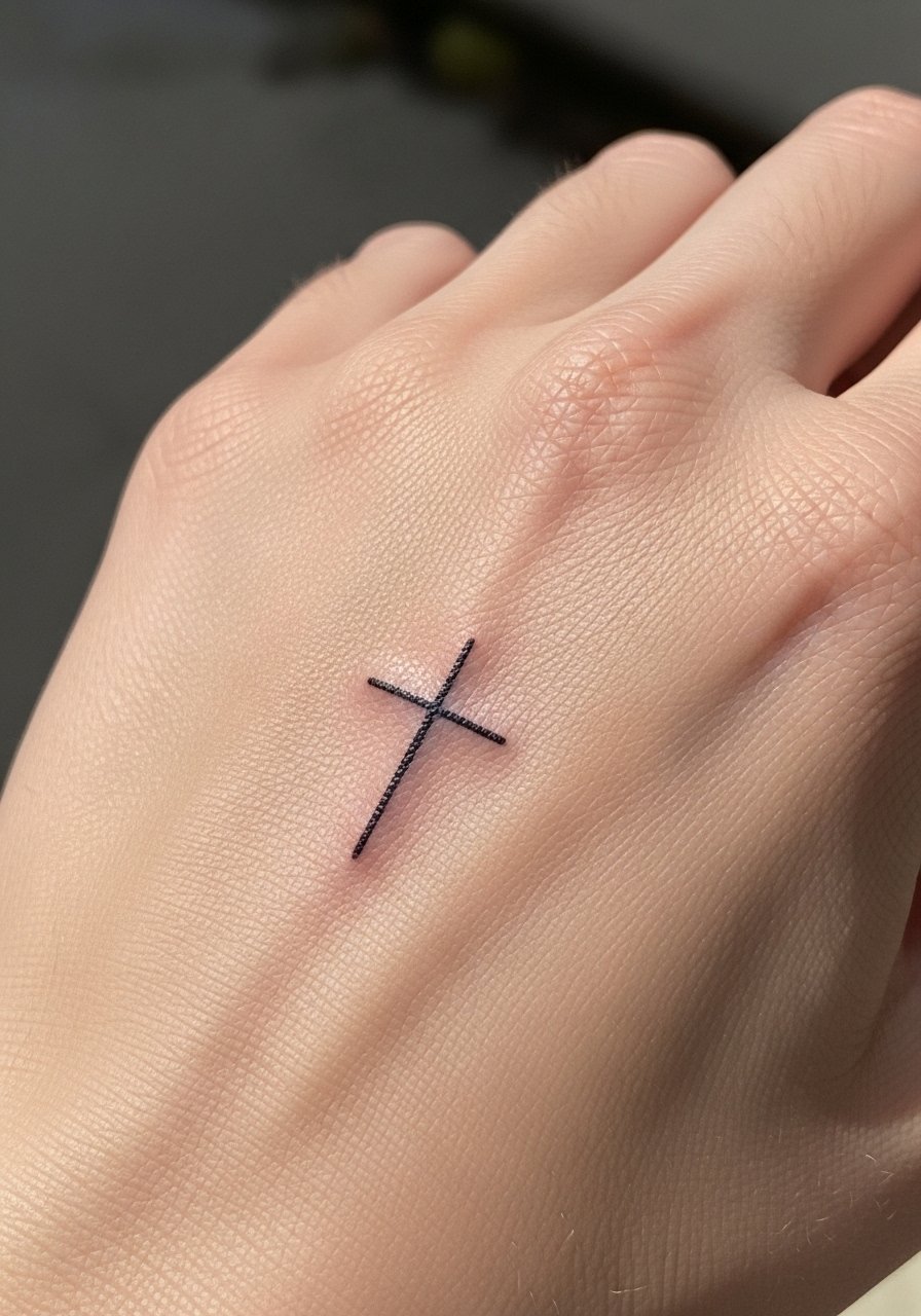 Hand tattoos are visible and raw—if you want your faith front-and-center, a minimal cross fits. Be aware: top-of-hand tattoos hurt more and the skin is more exposed, so healed texture can get patchy with time. I’ve seen minimalist hand pieces look great for a year or two and then need touch-ups; that’s normal. Common mistake: making the lines too thin—opt for slightly heavier single lines to help longevity. Ask your artist about how they handle healing on high-movement areas and whether a small Saniderm patch is recommended during the first few days.