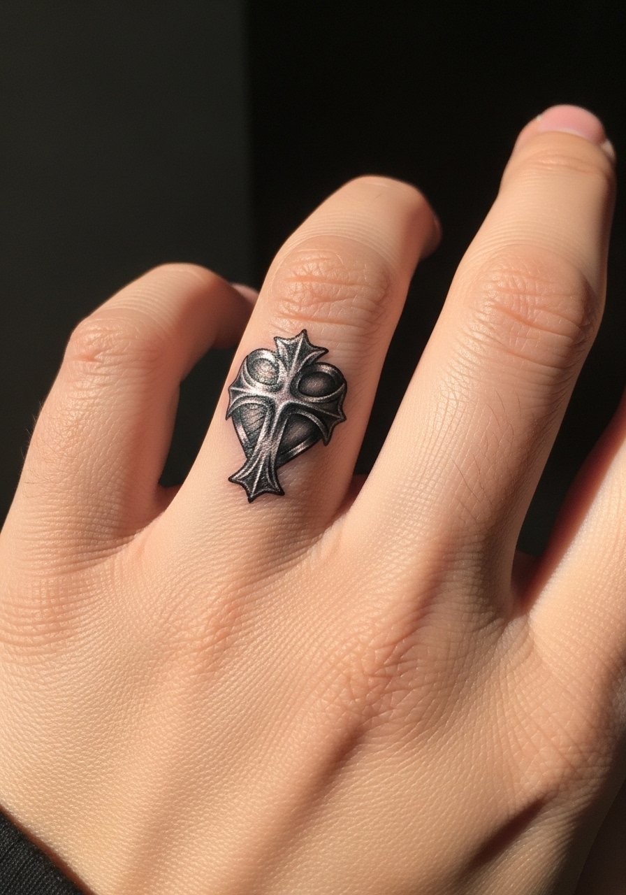 The chrome heart cross is a fashion-forward twist: think metallic shading, small scale, and finger placement. Fingers are painful and heal oddly because of constant use; that’s the trade-off for a stylish, visible mark. From what I’ve seen, geometric shading that mimics chrome looks great fresh but often needs touch-ups—ask your artist about contrast and how it heals on fingers. If you love the look, consider slight negative-space highlights so the chrome effect reads as it settles. Avoid putting too much tiny detail; fingers blur more than other spots.