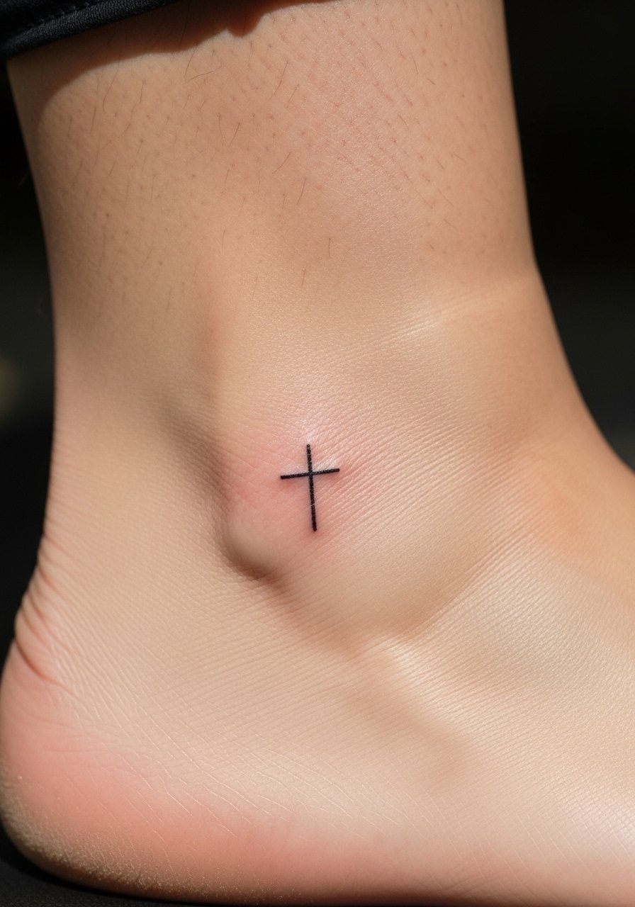 The ankle is a quiet place for a small cross—easy to hide, simple to maintain. Tiny single-needle lines can look refined, but they soften with time; I usually tell people to size up minimally so the junction remains crisp. Pain on the ankle is variable; expect some bone sensation. For aftercare, watch for rubbing from socks or shoes in the first week. This placement is ideal if you want a cross that’s intimate rather than public.