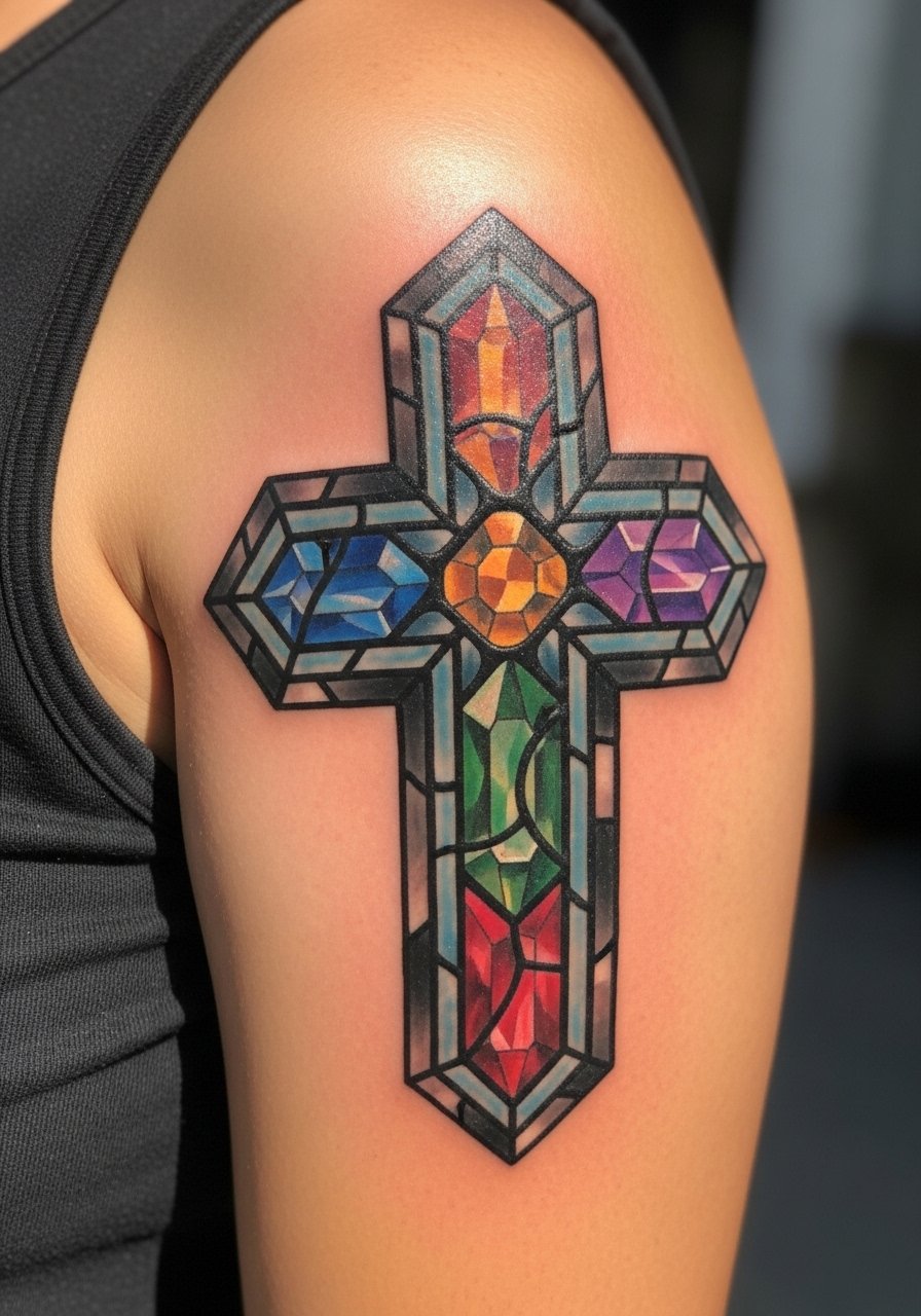 Stained-glass crosses let you wear church-window color palettes with modern tattoo craft. On the upper arm you have space for bold color saturation and it tends to age well if filled properly. I’ve noticed jewel tones like deep blues and reds maintain form if artists layer color correctly. Pain is moderate, and color pieces often require follow-up sessions to top-up saturation. Avoid pale washes that look strong fresh but fade; request healed examples from your artist. If you want an ornate look, find someone who does color realism and neo-traditional ornamentation.