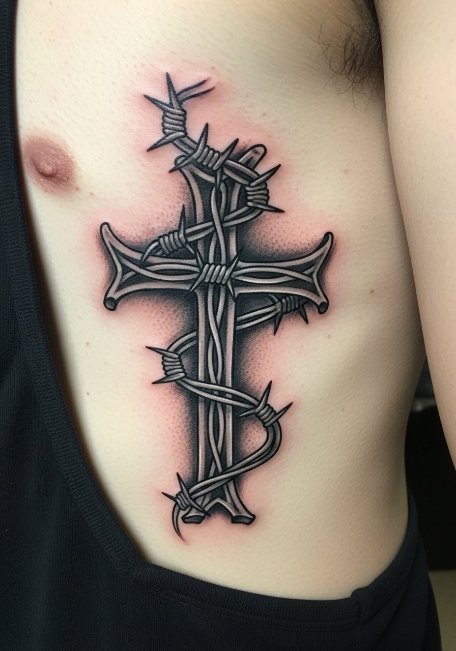 A barbed-wire cross blends grit with faith. The ribcage is a high-pain area but offers privacy and dramatic drape across the torso. From what I’ve seen, blackwork with strong contrast reads clearly on ribs, but expect a tougher healing window due to movement and clothing friction. Many people choose ribs knowing the pain is temporary and the result is personal. Common mistake: overcrowding the design with tiny barbs—keep the silhouette clean. Use breathable clothing while it heals to minimize irritation.