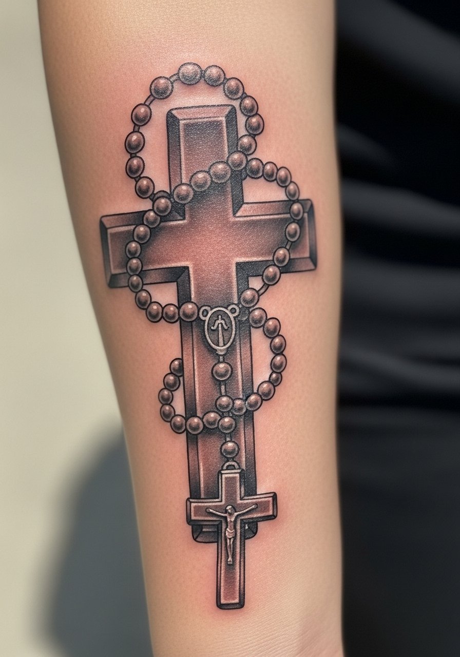 A rosary-wrapped cross is intimate and narrative—perfect for showing devotional practice. The forearm lets the beads curve naturally with arm movement and makes the rosary readable. In my experience, black and gray shading suits rosary knots and beads because it keeps the tactile look without demanding bright color maintenance. Common mistake: making the beads too small—scale ensures they read in photos and healed skin. If you want realism, ask for subtle highlights to suggest sheen on beads.