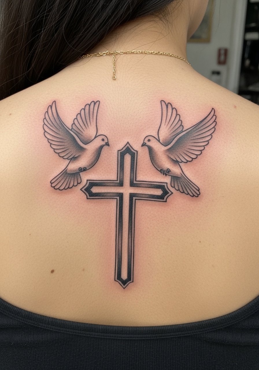 Doves around a cross read as peace and spiritual presence. Upper back provides horizontal space to balance birds in flight and a central cross. I’ve seen these compositions look timeless when the doves are given clean silhouettes against the cross. Pain is moderate on the upper back, and the area is easy to protect while healing. Don’t overcrowd the scene—let negative space let the birds feel like they’re moving around the cross.