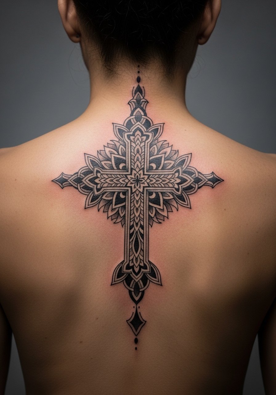 A mandala cross merges symmetry with sacred geometry—spine placement makes it meditative and centered. Spinal tattoos are painful but visually rewarding, and blackwork handles the long vertical canvas well. From conversations in tattoo groups I follow, matching symmetry is key; artists often work in multiple sittings to keep lines crisp. Avoid overly fine mandala details that will blur—focus on larger pattern modules that retain clarity as skin moves.
