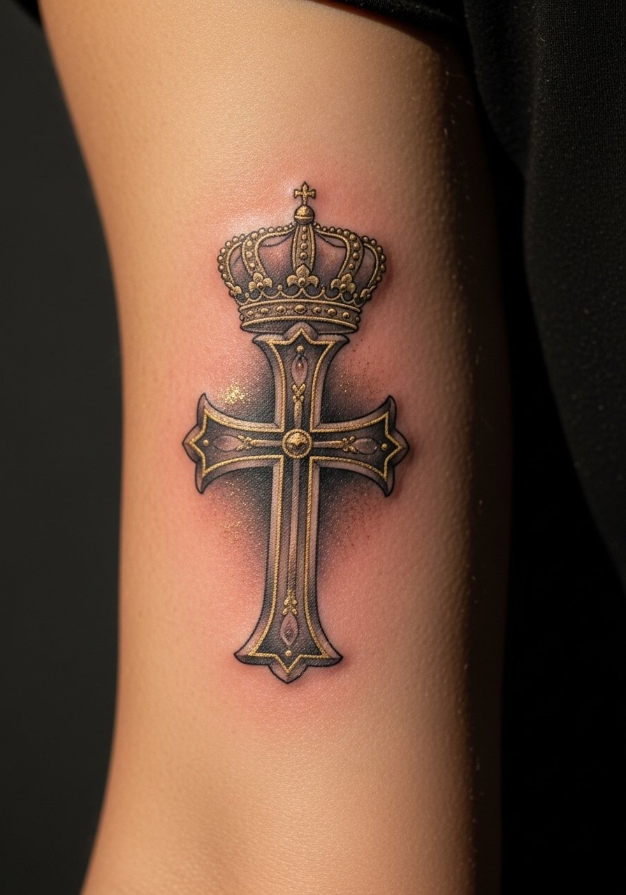 A crowned cross is a classic Christian symbol of kingship and sacrifice. Inner bicep placement keeps it personal but accessible for viewing. In my experience, inner bicep heals well and is low- to medium-pain, with color accents like gold needing careful saturation. Ask your artist about how metallic tones age on your skin tone—some colors need stronger layering to remain visible.