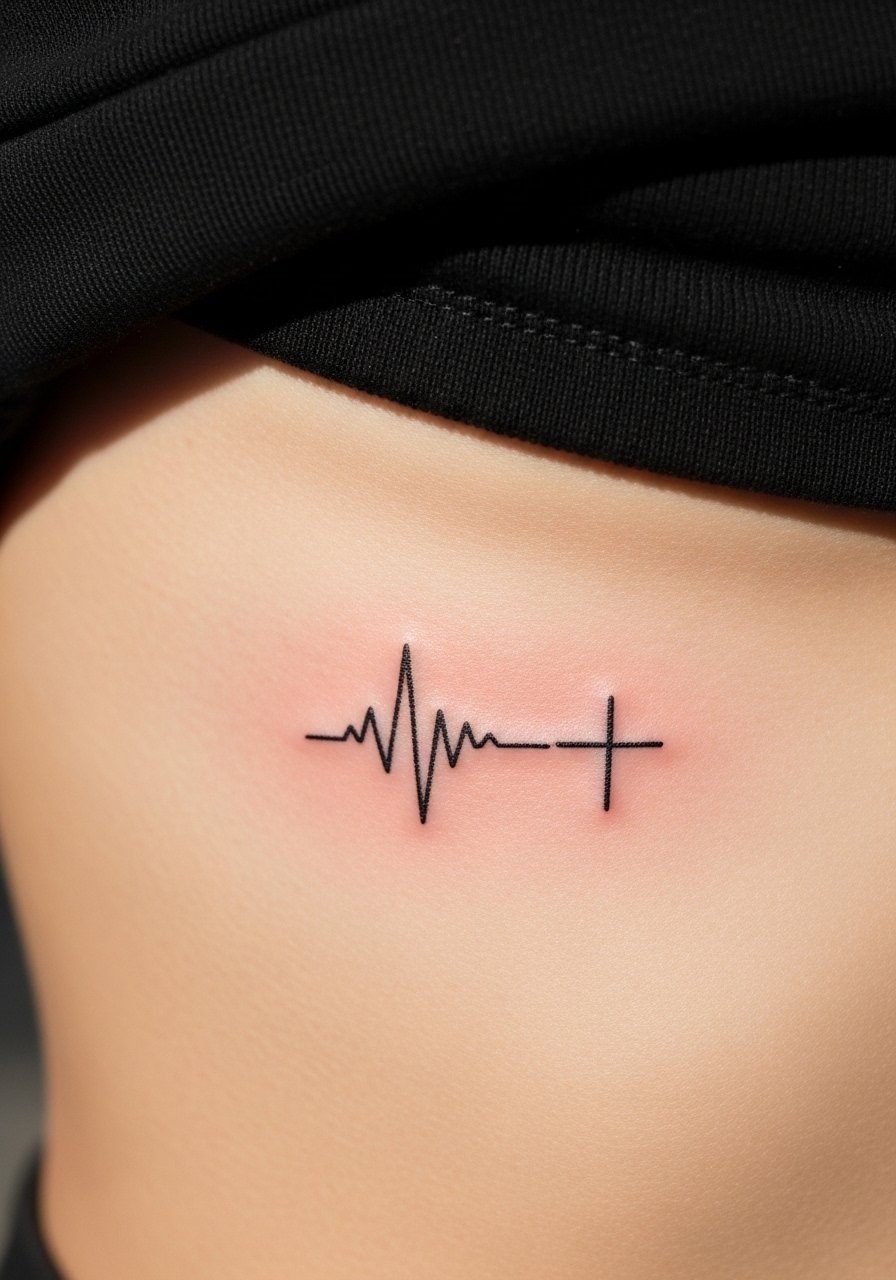 A heartbeat line leading to a cross is a poetic memorial motif that reads well on the ribs or side. It’s tiny but meaningful. Rib placement hurts more, but the intimate scale keeps sessions brief. I’ve seen this design done simply and effectively; avoid overly thin lines that disappear—go slightly bolder at junction points. Artists who do micro-realism can show you healed examples to set expectations.