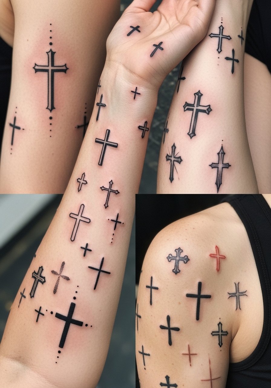 Patchwork collections let you build a faith narrative slowly—tiny crosses in different styles and placements added over time. I love this approach because it removes pressure to “get it all right now.” Pain and healing vary by spot, and you’ll learn what styles hold best on your skin. One common mistake is inconsistent scale; try to keep a visual rhythm so the collection reads like a cohesive set. Artists who do both fine line and blackwork can help plan future placements to balance the overall look.