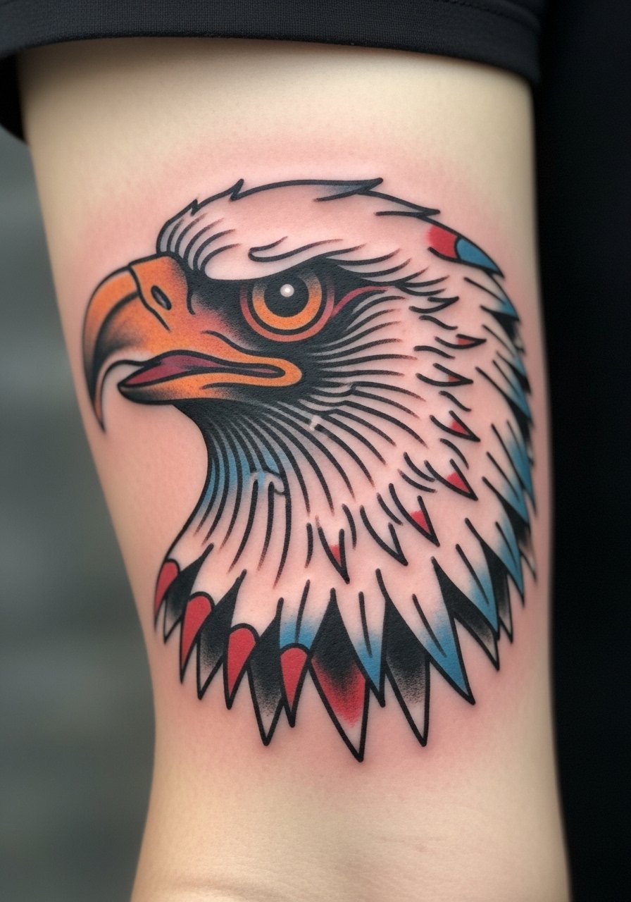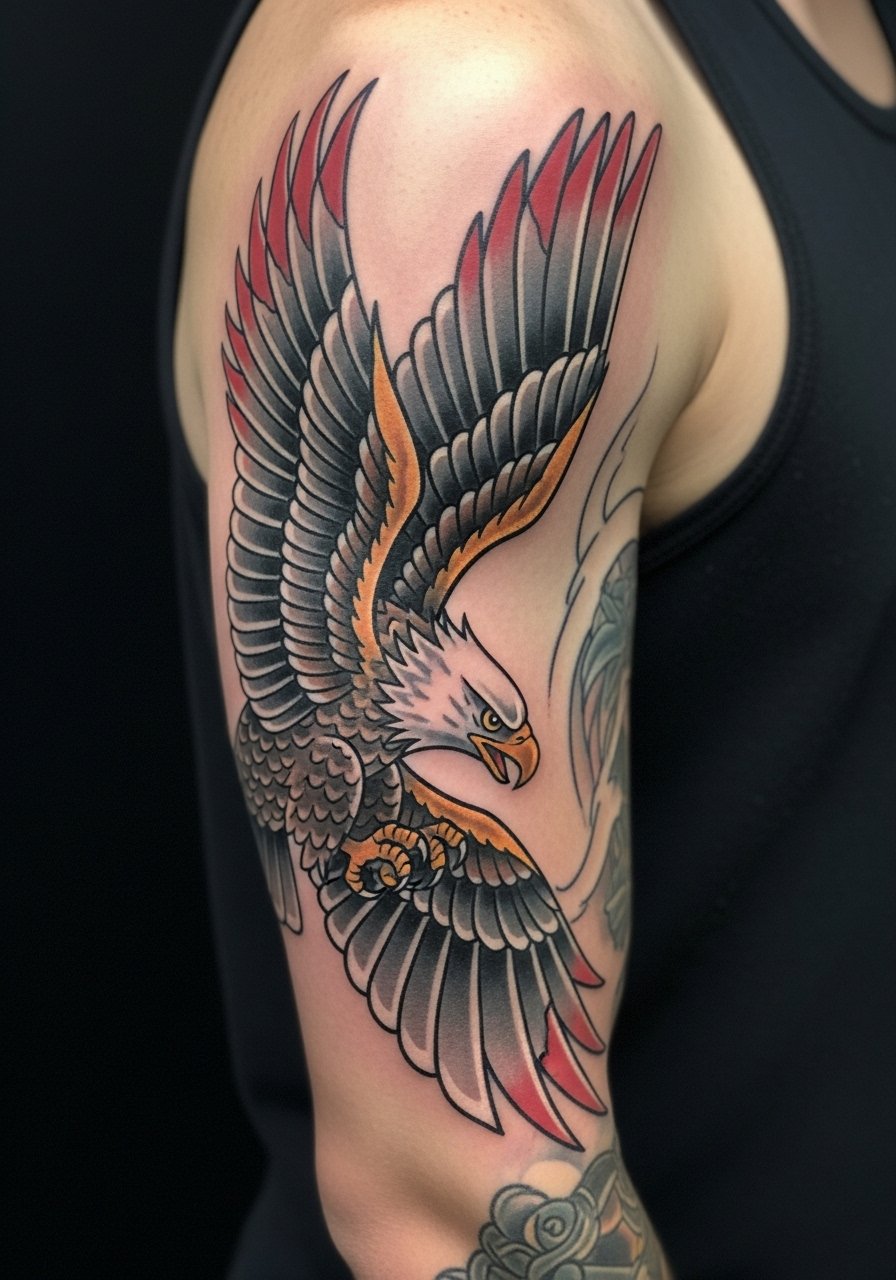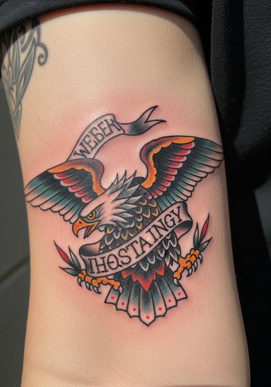 I picked this classic after seeing Sailor Jerry–inspired flash. The bold outlines and limited palette make it read as power and freedom even as it heals. Bicep skin is forgiving for linework, so pain is manageable. I've noticed strong black outlines age best; ask your artist for solid line weight. Avoid tiny feather details that blur into a mess later.