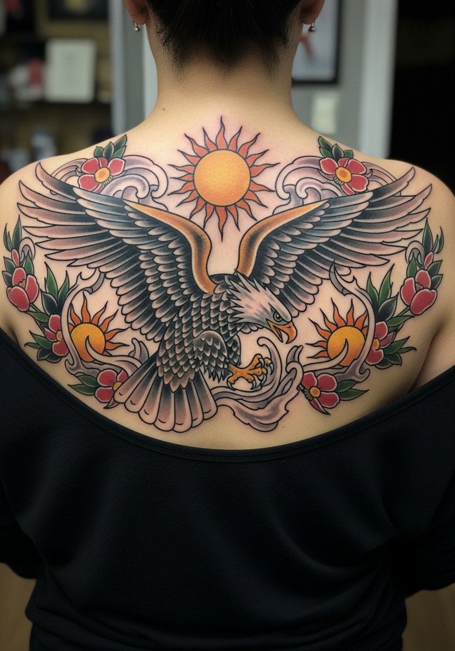 This is where artists get creative—flowers, sunbursts, and layered shading add personal narrative to the freedom symbol. Upper back gives space for wings to flow with the body. Expect multi-session work and soreness between sessions. From what I've seen, neo-traditional color can look rich healed if saturation is right. Don’t cram too many tiny details; they lose clarity on large curved surfaces.