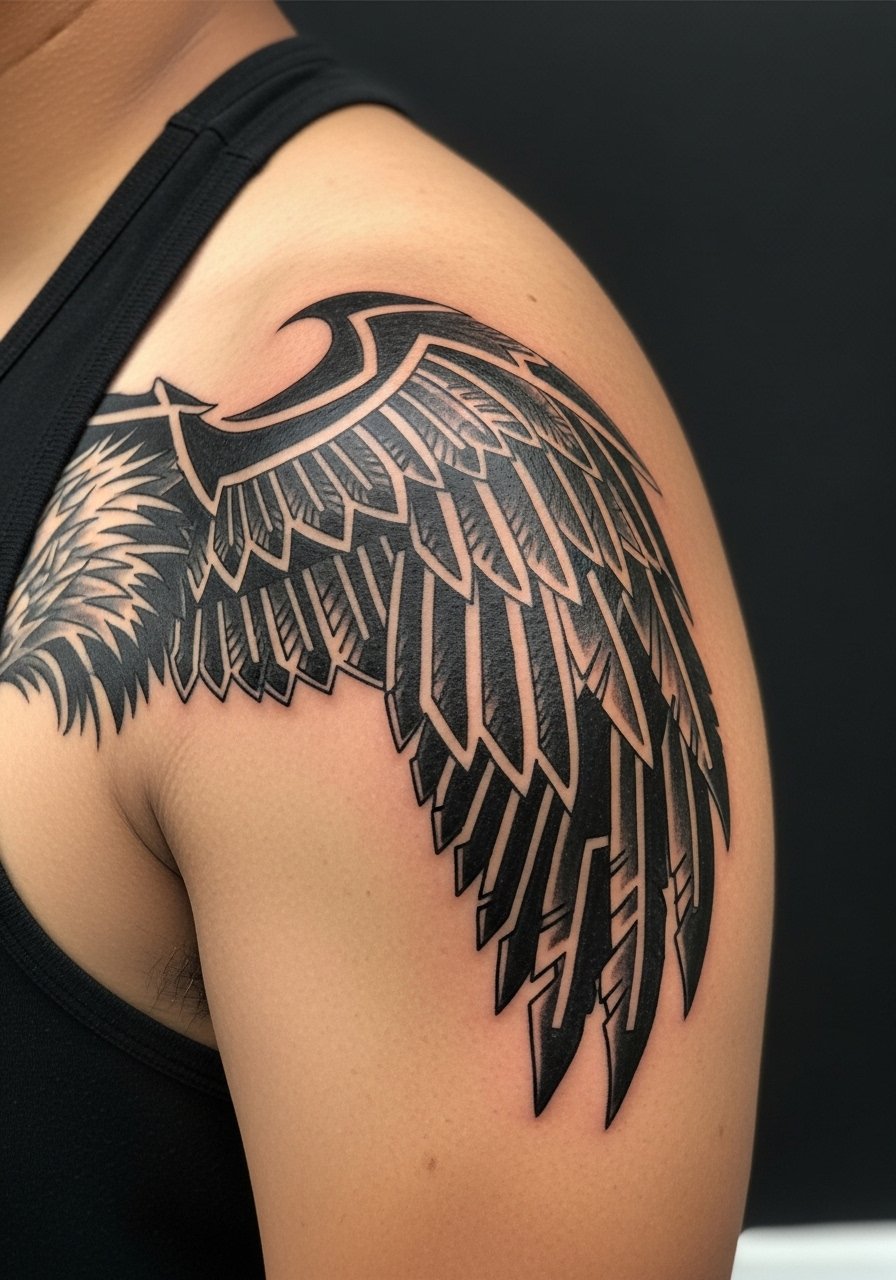 Tribal wings use bold geometry to convey strength. The shoulder cap lets designs wrap naturally. I like this if you want a timeless, masculine feel that ages predictably. Artists who specialize in geometric blackwork produce the clean fills you want. Avoid overly thin lines; tribal needs weight to remain crisp years later.