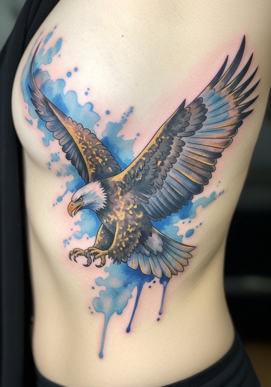 Ribcage placement is dramatic but painful. Watercolor washes create a spiritual, airy feel that pairs with the eagle in flight. From what I've seen, watercolor fades faster, so artists often pair it with a light black outline for structure. Don’t expect razor-sharp edges from watercolor—embrace the blended look and plan touch-ups down the road.