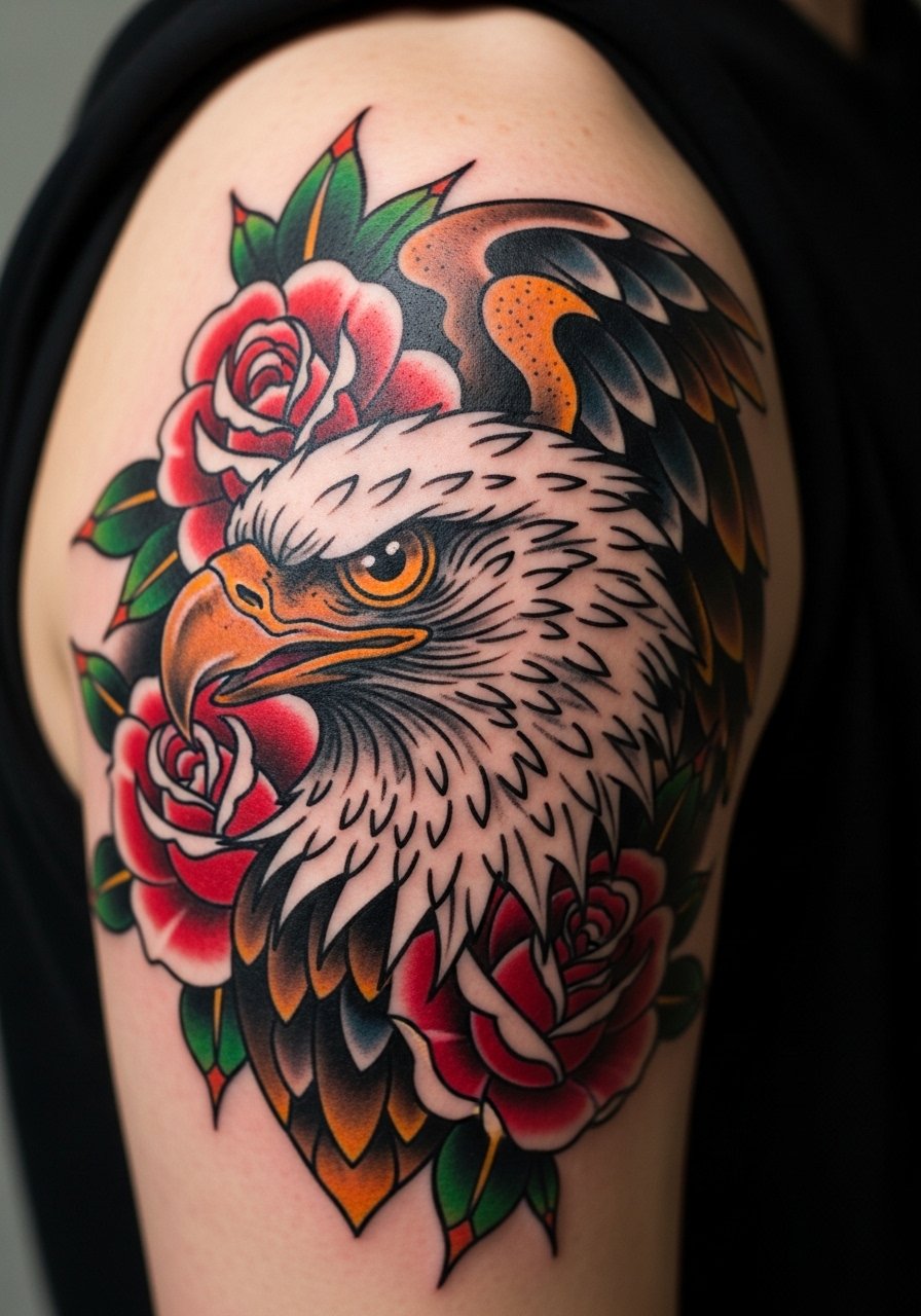 8. Neo-Traditional Eagle with Roses on Upper Arm
