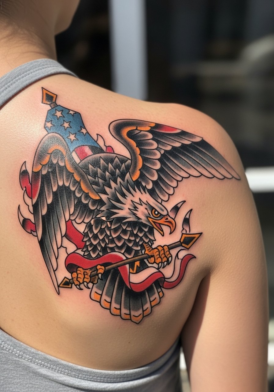 This is a classic patriotic presentation. Shoulder blades let the wings and talons spread wide with body movement. From my experience, traditional color palettes tend to age gracefully when lines are strong. Avoid tiny flag details that become indistinct; keep symbols bold and readable.
